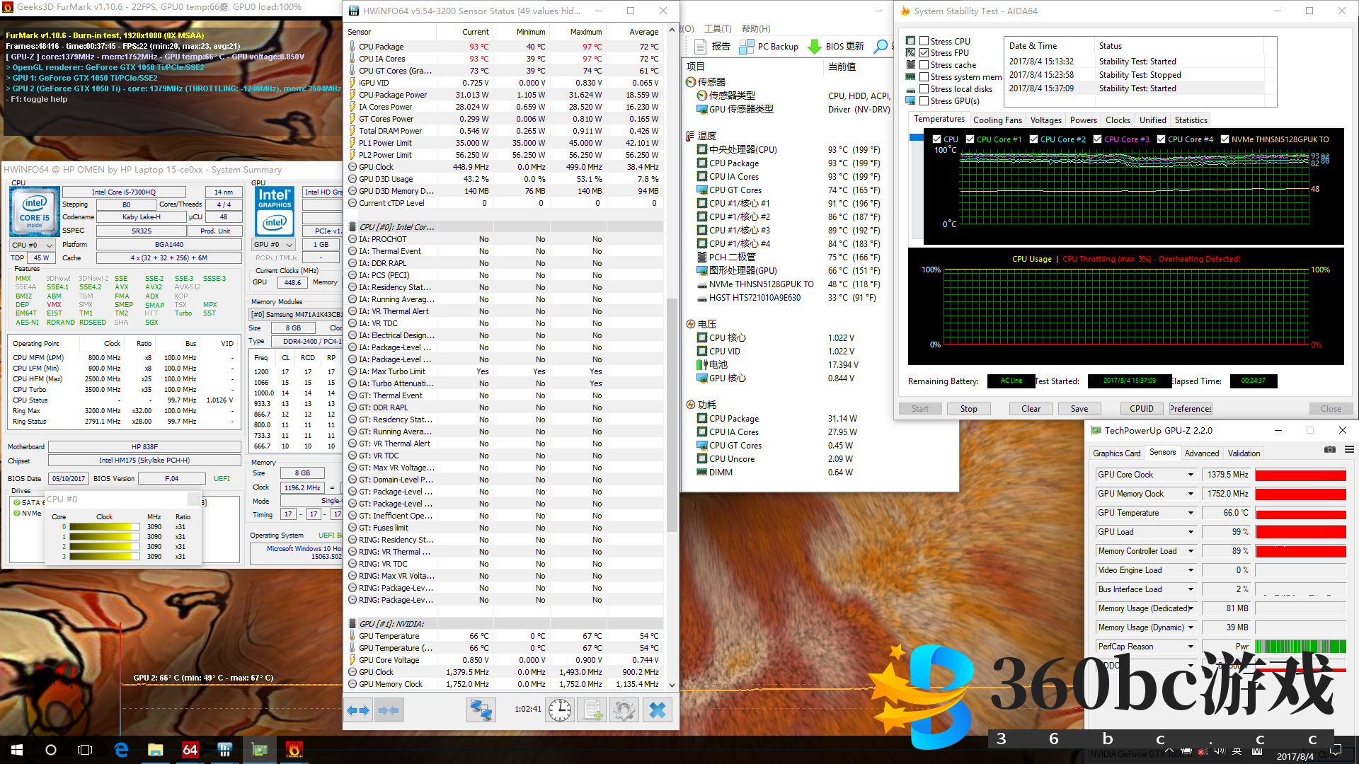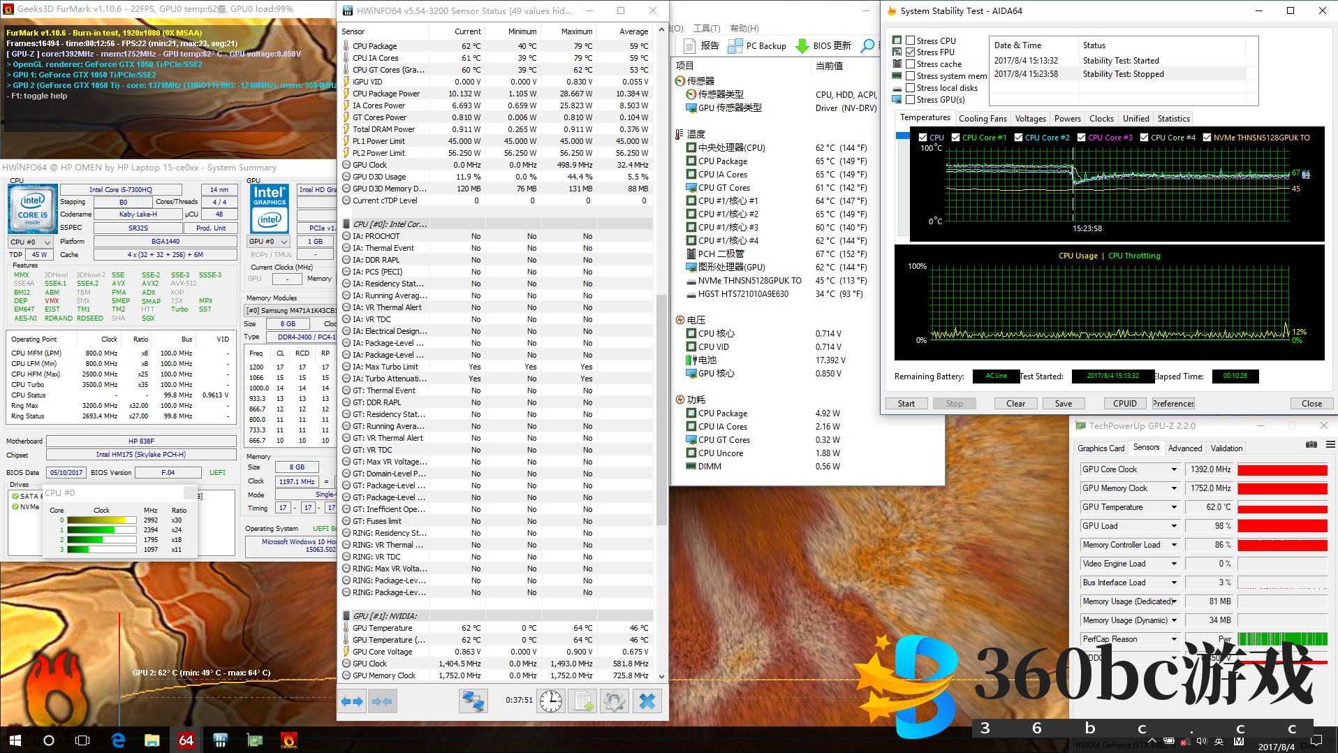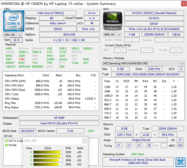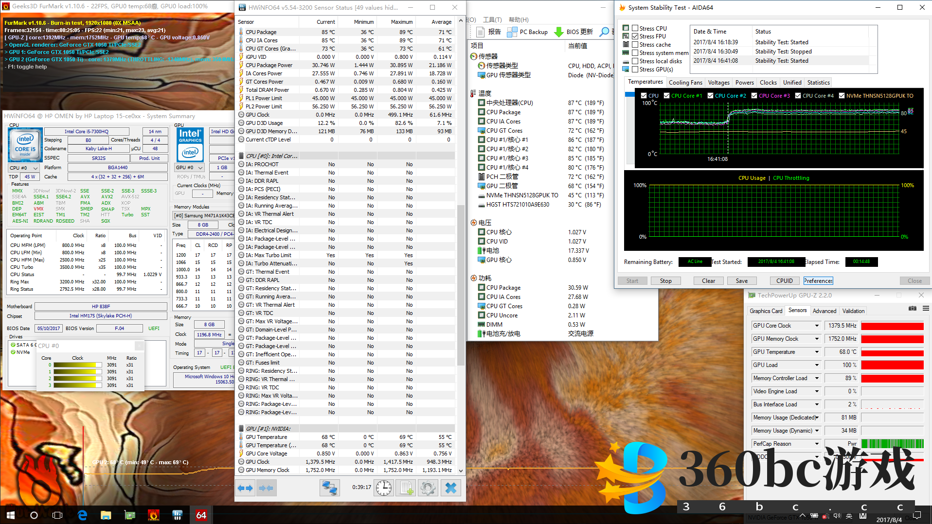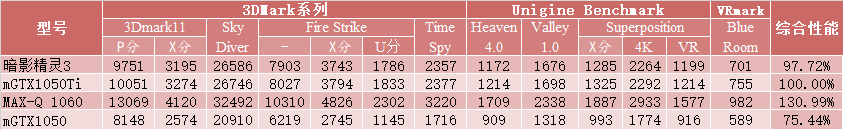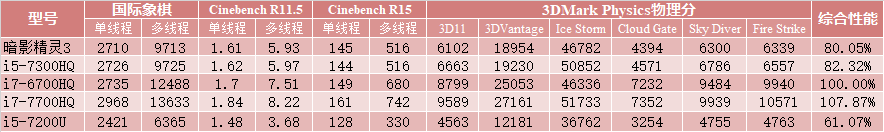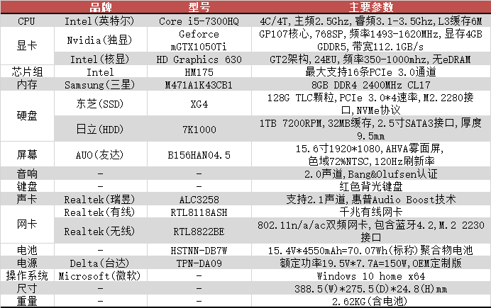 ![]() ![]() ![]() 笔吧评测室的评测为原创文章,转载时请标明出处和作者,欢迎大家的转载。 PS:图片点击即可放大 目录 【0】视频 【1】简评 【2】配置&参数 1.CPU 2.显卡 3.主板 4.内存 5.硬盘 6.电池 7.屏幕 【3】性能 1.CPU&内存 2.显卡 3.硬盘&其它 【4】游戏 1.巫师3:狂猎 2.刺客信条:枭雄 3.古墓丽影:崛起 4.战地1 5.泰坦陨落2 6.看门狗2 7.量子破碎 8.幽灵行动:荒野 【5】散热&评价 0.待机 1.CPU烤机 2.GPU烤机 3.CPU+GPU双烤 4.游戏温度 5.表面温度 6.散热模块 7.小结 【6】拆解 【7】其它测试 1.功耗 2.噪音 3.续航 【8】总结 【笔吧评测室】屏幕素质最好的主流游戏本?惠普暗影精灵III代电竞版评测_数码_科技_bilibili_哔哩哔哩https://www.bilibili.com/video/av14478640/视频部分可以直观的看到整机的外观和外设效果,并且简单介绍了各方面的参数和性能,一般的消费者观看视频即可了解到绝大部分的信息。欢迎大家在视频中吐槽,我们会根据视频留言逐步改善内容,使得视频更加完善,逐步取代图文的内容。 本章是为初学者以及某些不愿意详细了解评测的人士准备的。不过,这类简短的总结或多或少会夹杂笔者的主观看法在其中,并非客观的描述机器的特点,建议有能力者将整体评测浏览完毕,以消除部分主观的因素。 PS:本节采用评分的方式来展现不同方面上机器的表现,★为1分,☆为0.5分。评分范围0-5,意味着大部分机器都只有3分左右,表现很差就是0分,只有很出色的才有接近5分的可能。 再次谨记,这是主观评价,无法和所有玩家的想法一致,本节评价仅供参考。 下面介绍配置和参数。 暗影精灵3是私模,模具代号为G3AA,为广达设计和制造。1代和2代暗影精灵同样为广达设计,模具代号为X1PD/G35A。虽然2代和3代模具代号很相似,但无论是内部结构设计还是外观上都有本质的区别,是完全不同的两个模具 此次评测的机器具体型号为OMEN 15-CE007TX,媒体测试机。测试机为中配,低配除了没有固态外,显卡的规格降至M1050 2G,而高配则是i7-7700HQ,只要没有标注电竞版的屏幕都只是45%NTSC的低端IPS。 主要机器参数: ![]() 接口分布: ![]() PS:USB3.1 Gen1(TypeA)就是一般大家所称的USB3.0,由于最新规范中将3.0说法并入3.1中,很多厂商都开始玩起了文字游戏,只要注意Gen1还是Gen2就可以避免被误导。TypeA和TypeC也只是接口形状变化,和速度快慢无关。尤其要注意TypeC的宣传,此接口既可以是3.1也可以是3.0甚至2.0,而支持DP视频输出以及雷电3都是可选配置,TypeC≠USB3.1+雷电。 这一代暗影精灵3的接口有所升级,USB全部是3.0,多了一个带视频的TypeC但不支持雷电,也有了miniDP接口。不过内部拓展性上还是一样,在15.6寸游戏本中属于中等偏上的拓展性。有一点需要提醒一下,测试机的固态为XG4,实际量产机应该为三星PM961。 鲁大师硬件参数截图 ![]() 鲁大师识别出了品牌和型号,准确无误。 ![]() i5-7300HQ,七代Kaby Lake架构,BGA封装不可更换。四核四线程,支持Intel睿频加速技术,主频2.5GHz最大睿频3.5GHz,L3缓存6MB。14nm制程,热设计功耗45W。7300HQ相比6300HQ提升了0.2GHz的主频,睿频提升了0.3GHz,其他似乎没有变化。 ![]() HWINFO截图,CPU是正式版产品,封装为BGA1440,S-SPEC为SR32S,步进B0,最低倍频8x。 ![]() AIDA64里的CPUID截图,可以看到睿频为35x/33x/32x/31x,刚好都是比6300HQ多3个倍频。短时睿频功耗限制56.3W,持续时间28秒,长时睿频功耗限制45W,软件显示这些数值是Unlocked,说明可以用XTU解锁CPU功耗。 ![]() XTU信息,这是Intel的官方调节工具,可调节很多CPU参数,甚至内存参数。暗影精灵3无法调节倍频但可以调节电压和功耗限制,其中电流限制默认为70A。 ![]() 暗影精灵3的独显型号为mGTX1050Ti,4GB显存(三星颗粒)。厂商标识为HP(103C),这就是惠普的设备ID。默认频率1493mhz,boost频率为1620mhz,显存频率等效7008mhz。显卡核心采用GP107核心,启用6组SM共768SP,显存控制器有2组,为128BIT。这代笔记本GTX系列显卡已经彻底抛弃了原本的“M”后缀命名方式,跟台式机型号完全一致,我们前面加“m”是为了跟台式机稍有区分,“m”代表‘mobile’即移动版,毕竟具体参数上和台式机同型号卡还是稍有不同的。台式机1050Ti公版的规格与M1050Ti大致相同,但后者标称频率更高点,然而TDP还是不同的。 ![]() M1050Ti的电压频率截图,最高boost频率为1746.5MHz,满载核心电压为1.075V。不过这个频率并不能坚持很久,小渲染一段时间后频率会缩水,14nm工艺对于温度更敏感。 ![]() CUDA-Z截图,这里显示了GPU有关CUDA的详细参数。 ![]() NvidiaInspector截图,这里可以看到独显(N卡)的某些其他信息,比如可超频范围,电压调节范围,高温降频线和TDP控制阀等。M1050Ti不可解锁TDP控制阀,降频线为92℃。原来的M结尾笔记本显卡,都只有135MHz的可超频空间,现在的M1050Ti跟台式机显卡一样,相当于解锁超频限制了。 ![]() 主板信息,制造商显示为HP,模型为838F。芯片组为Kaby Lake,PCH是HM175,BIOS类型为AMI,日期2017-5-10,版本F.04。 ![]() AIDA64中的北桥信息,Intel早在二代酷睿i系列就将北桥整合进CPU中,主板上已经没有实际意义上的北桥了。北桥的主要作用是负责和内存的通讯和PCIe中显卡的通讯,核显的通讯也在北桥中。 从显示信息上看,7代标压U原生支持DDR4-2400(实际6代也支持),机器最大支持64G内存即四个插槽(实际只有2个),支持VT-d(当然也支持VT-x),核显已启用,独显M1050Ti占用x8带宽。 ![]() 南桥信息,实际上Intel的新酷睿平台也将部分南桥的功能整合到CPU中,