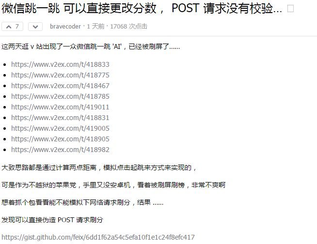 可想而知,程序员为了高分也真是操碎了心,对此,不少网友表示,如今真是一个技术改变战绩的时代。 其实不然,当很多程序员开发外挂的同时,没想到这也是一个 Bug 刷新战绩的游戏。近日,有网友在 V2EX 网站上发布了一篇题为《微信跳一跳 可以直接更改分数 》