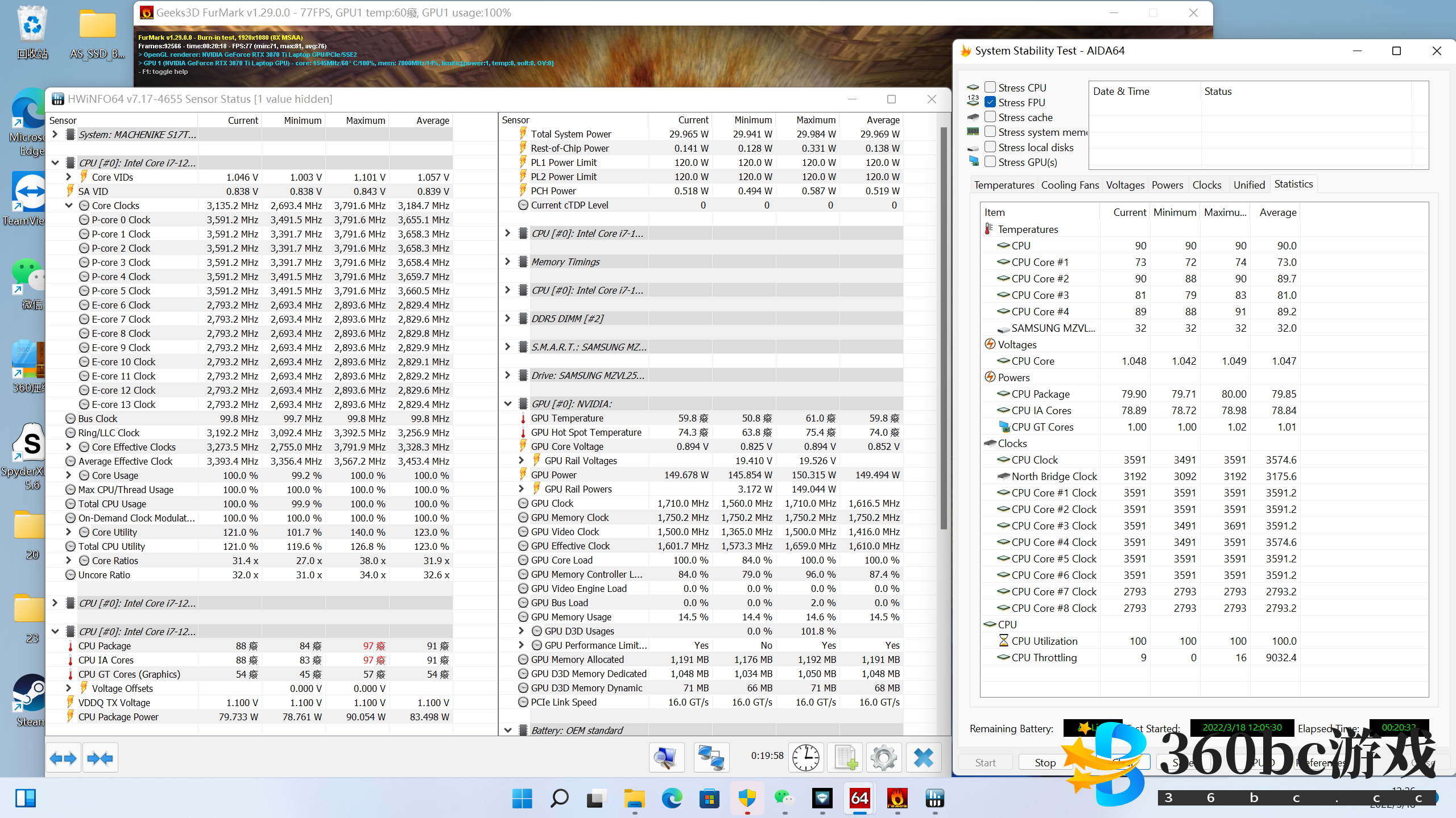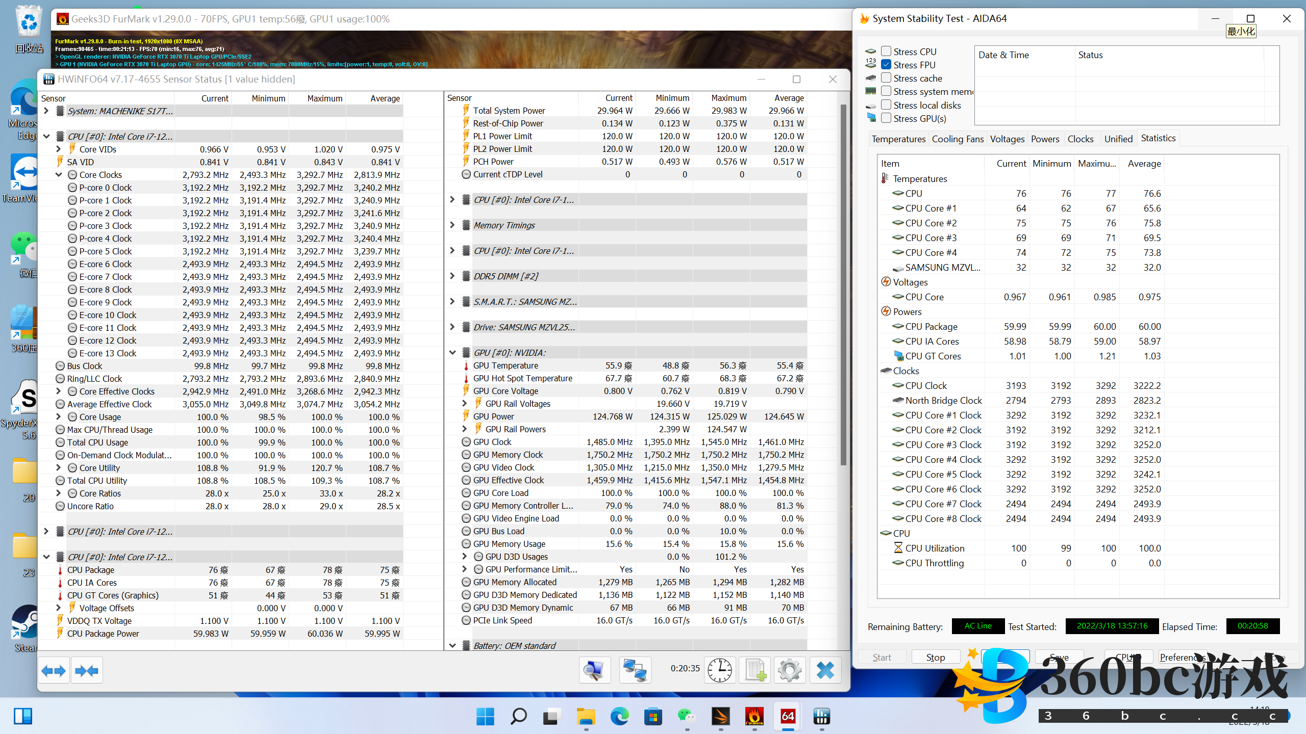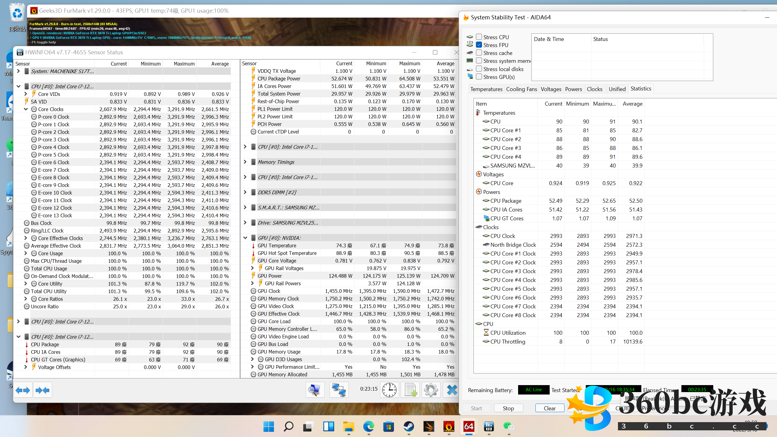 机械师发布了一款17英寸的水冷笔记本,型号为「星辰17」,在这款笔记本能上,机械师试图通过外置的水冷散热器来进一步提高使用体验(静音),从而让一套最高配置为GeForce RTX 3070 Ti 笔记本电脑GPU (下文简称“RTX 3070 Ti”)、Intel 12代酷睿i9-12900H处理器(下文简称“i9-12900H”,功耗释放250W的笔记本能够在较低的温度下运行,理论上说,温度的大幅度下降也会提高笔记本的CPU/GPU频率,从而增加整机的性能。 我手头的这台“官配版”机械师星辰17,售价12999元。 配置如下: CPU:i7-12700H (风冷下86W,水冷下102W) GPU: RTX 3070 Ti (支持独显直连,风冷水冷下都能达到150W) 硬盘:三星PM9A1 512G (最多支持4TB);内存:金泰克4800Hz 16G DDR5双通道 (最多支持64G) 功耗释放:风冷180W,水冷230W;电池65Wh 屏幕:2K165Hz高色域,型号为BOE NE173QHM-NY2 (可选2K 240Hz屏幕) 尺寸:39*26*2.5cm,机身2.53kg,适配器1.04kg 售价:12999元 ![]() 从配置上看,星辰17定位显然是“高端游戏本”,保障其游戏性能的核心配件便是RTX 3070 Ti。RTX 3070 Ti是NVIDIA在2022年发布的新款笔记本电脑GPU,拥有5888个流处理器,8G内存,以及诸多的NVIDIA黑科技,包括但不限于深度学习超采样(DLSS)、光追(RT)、系统延迟降低(NVIDIA Reflex)等。此外,由 AI 赋能的全新 Max-Q 技术,令其在相对薄的笔记本电脑的表现出远超以往的性能。Max-Q的全新特性包括:1,Rapid Core Scaling 智能核心优化 – 优化活跃核心以更高频率运行,可在移动办公时,为创意密集型工作和理工科应用提供更好的性能。2,CPU Optimizer 智能协作 - 使 GPU 和 CPU 更好地协同工作,从而提供出色的性能表现和理想的温控水平。3,Battery Boost 2.0 续航增强 – 实现 GPU 和 CPU 功耗、电池电量、画质和帧率之间的平衡,延长电池续航时间。 ![]() RTX 3070 Ti性能和目前的移动端的旗舰卡RTX 3080 Ti的差距不到10%,毫无疑问属于高端显卡!现阶段,搭载RTX 3080 Ti和RTX 3080的游戏本都非常贵。RTX 3070 Ti游戏本的价格要亲民的多,RTX 3070 Ti也因此被认为是极具性价比的高端游戏显卡。 ![]() 在水冷的加持下,RTX 3070 Ti能够最大限度发挥其潜能,包括频率更高,温度更低以及噪音更小。其他搭载RTX 3070 Ti的笔记本即使也能给到150W GPU功耗,但是性能会被温度拖累,导致无法完全发挥。 需要说明的是,星辰17的水冷是可拆卸式的,这意味着,你可以在外出的时候只带上笔记本本体,在风冷模式下使用,以获得便携性。而在家里时就连上水冷使用,以获得更好的性能和体验。此外,星辰17并不需要专用的水冷液,直接灌入纯净水即可。 星辰17的外观设计或许属于“重金属风格”,表示度较高。A面的不对称设计颇有现代科技感,让人一看就知道它是高端笔记本。 ![]() 光照下,金属质感极佳! ![]() 打开后正面不如A面惊艳,看起来和其他机械师游戏本形似,我个人很不喜欢屏幕面和键盘面之间的缝隙。凡是16:9屏幕,屏幕肯定比机身要短,所以要么是大下巴设计,要么就是这种留出缝隙,这两种设计都不好看。所以我强烈建议笔记本厂家采用16:10屏幕。 ![]() 全键盘。因为笔记本尺寸较大,所以键位之间可以保留足够的空间。这个设计对游戏本是非常有必要的,连在一起的键位很容易引发误触问题。比如我用全能本玩dota2按Q键放技能时常常会把Q和W同时按下,导致技能施放失败。 ![]() 作为游戏本来说,接口不算多。USB-A只有3个,USB-C(雷电)一个,HDMI是真2.1版本,和雷电口一样都可以支持4K 144Hz,也就是说,这台笔记本最多可以外接2个4K144Hz显示器。 ![]() 拆解图如下,被我用蓝色标注的是连接水冷散热器的热管。CPU和GPU也各有3根热管,所有热管都做过防氧化处理以提高使用寿命。可以看到,水冷的热管并不是直接和CPU或者GPU连接,而是“搭在”CPU/GPU热管上的,相当于和CPU/GPU间接地连接。间接连接应该是为水冷的自由拆卸而做出的妥协。因为热管本身是需要密封的,而连接水冷的热管必须是开放的,否则无法接上水冷管。如果水冷热管和CPU/GPU直连,那拆掉水冷后,直连CPU/GPU的热管变成了几乎无用的不封口空心管,导致CPU/GPU的散热能力大幅度降低。因而,如果要让水冷可拆卸,那就必须间接连接,如果直接连接,水冷就不可以做成可拆卸式,水冷不可拆会使得笔记本失去便携性,那样的话还不如直接买台式电脑。 ![]() 其实,刚看到拆解图时,我非常担心外接水冷的实际作用,因为水冷和CPU/GPU的间接连接肯定不如直接连接好。好在后续的实测打消了我的顾虑。 水冷长得像小机箱,安装没有难度或者特别的注意事项,按照客服给的教程一步步来就行。 ![]() 水冷有两种档位,分别是超静音和超性能,前者强调使用体验,功耗185W,和风冷模式(180W)相近,但是特别安静;后者强调极限性能,功耗释放会提升到230W。 首先是最常见的衡量游戏性能3Dmark Time Spy测试,星辰17在风冷/水冷超静音/水冷超性能三种模式下,跑分如下。可以看到,水冷超安静模式下,性能略微强于风冷模式。而水冷超性能模式下,性能比风冷模式强10%左右,11839的GPU跑分,比RTX 3070 Ti的全网平均分高了4.2%。 ![]() R20和R23测试中,多核方面,超静音模式的低于风冷模式,这一测试结果和3DMark中的相反,水冷超性能模式比风冷模式强9%(R20)和5%(R23);单核方面,三种模式的跑分都非常接近。 ![]() 风冷双烤20分钟,CPU 52.5W,大核频率2.9G,小核频率2.4G,温度89度;GPU 125W,频率1.455G,温度74.3度,最热点88.9度。0.5米外噪音50.3db,有明显风扇声。 *请注意,不同评测中的噪音