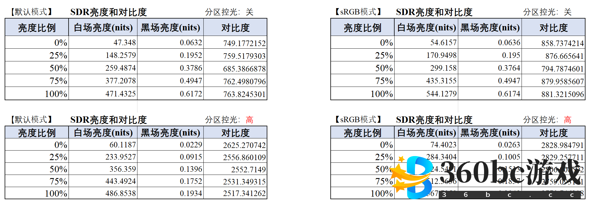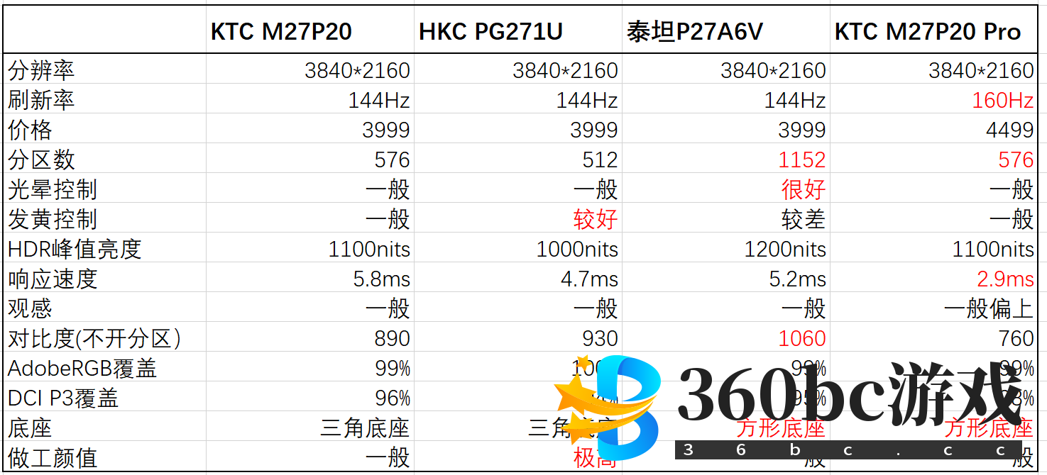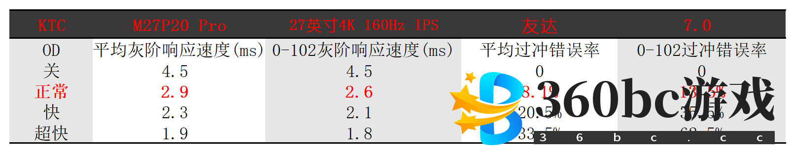 今年,MiniLED显示器非常流行。MiniLED显示器凭借超高的HDR亮度(至少HDR1000)、超高色域覆盖率(99% AdobeRGB或者99% DCI P3)以及超多的分区控光数(376-2304个),成为了在HDR电影、HDR游戏方面画质远超传统显示器的存在。 4K 144Hz的MiniLED显示器原本定位高端,比如第一款4K 144Hz MiniLED显示器预售价格就是10999元。但是在几个内卷狂魔(KTC、HKC和泰坦军团)的疯狂价格战中,最终卷到4000多元。 4000多元4K 144Hz MiniLED显示器虽然性价比突出,但是有一个致命缺点——他们的面板都是“老古董”友达2.3,一款2018年诞生的老面板。这个面板虽然便宜,但是存在观感较差,响应速度较慢的问题。 今年中期,友达2.3的继任者终于出现了,型号名为友达7.0。相比友达2.3而言改进了观感,极大幅度提升了响应速度,此外,刷新率从144Hz提高到160Hz,原厂模组版本的友达7.0还拥有硬件低蓝光。当然,MiniLED不可能用原厂模组,因为原厂模组包括面板和原厂背光,而MiniLED本身就是一种第三方背光。MiniLED显示器必然需要用MiniLED背光来替换原厂背光,所以只要是MiniLED显示器就不可能是原厂模组,所以也不会有硬件低蓝光这一特性。 KTC率先使用友达7.0面板,改进了自家MiniLED显示器——M27P20,做出了新款的M27P20 Pro。配置为27英寸,4K 160Hz,576个控光分区,HDR1000,官标色域98% DCI P3色域。 售价为4499元,比老款贵了500元。从性价比的角度看,我认为M27P20 Pro这500元的差价是物超所值的,毕竟观感、响应速度、刷新率的提升都是实打实的。 不过,买了M27P20的用户也不用觉得被背刺了,理由:①早买早享受。②如果不玩FPS游戏的话,响应速度快慢其实影响不大。③友达7.0也有一些友达2.3所没有的缺陷........ 省流助手:没换壳子,和M27P20一样。 正面依然是平平无奇,中规中矩,看起来就是公模。底座小巧但是很稳定,这应该能被不少人喜欢:对桌面要求小,不会碰到鼠标。 ![]() 背面采用几何形切割风格,有一定的设计感,但是材料质感一般,缺少高级感。有LED灯,灯的颜色可以变,虽然灯很小且日常使用中也看不到灯,所以意义不大,但是聊胜于无。 ![]() 接口包括2个USB-A,USB-B(用来激活USB-A),90W USB Type-C(也可以激活USB-A),DP1.4(DSC),2个HDMI 2.1以及音频口。 ![]() C口支持一线通,单线就能同时实现4K 144Hz视频信号传输、数据传输、90W充电。 HDMI 2.1接口带宽很可能是48Gbps(在得到官方规格书确认前,我们不能给出准确答案,目测只能测出它的带宽不低于32Gbps)。可以实现4K 160Hz 8bit、4K 144Hz 10bit。 USB Type-C外接笔记本(独显直连),最多4K 160Hz 8bit,或者4K 120Hz 10bit。这是因为USB Type-C虽然内置DP1.4协议,但是笔记本显卡本身不支持DSC(显示流压缩技术),所以带宽只有32.4Gbps。 DP 1.4搭配支持DSC的显卡(RTX20系以上)可以实现4K 160Hz 10bit。请注意,京东商品介绍里的官方数据里写的是“最多支持4K 160Hz 8bit或者4K 120Hz 10bit”。这就是官方写错了而已。为了防止有人非要和我杠,发出类似“你比官方还懂?”的无聊质疑,我把4K 160Hz 10bit全开的截图摆在下面。 ![]() 不开分区控光的话,全程DC调光,不闪屏。 开分区控光的话,4960Hz 高频PWM调光(是160Hz刷新率的31倍),属于高频PWM,也是不闪屏。 8bit+FRC,即抖10bit。 支持色域切换,默认模式下,100% sRGB,99% AdobeRGB,98% DCI P3覆盖率。广色域覆盖率极高,几乎堪称完美,能够满足所有类型的绘图设计需求,也能够实现极好的HDR效果! (稍微夸一下KTC,真的很诚实,只有98% P3的情况下就宣传98% P3,一点也不添油加醋) sRGB模式下,96% sRGB,没有过饱和问题,适合那些不喜欢广色域过饱和的用户。虽然覆盖率没有达到100% sRGB,但是日常使用影响不大,只影响专业设计。不过做专业设计的话完全可以用默认的色域来做,Adobe等专业设计软件都是可以支持广色域的。 ![]() KTC的MiniLED显示器色域也是目前几家MiniLED大厂中最好的,因为KTC多了一个量子点技术,可以提高色域覆盖率。 ![]() 默认模式不开分区控光,对比度大概在750-760,不太好,比老面板的KTC M27P20低100多,暗处显示器效果会差一些。默认模式最高470nits亮度,sRGB模式稍高,达到了544nits。看来,新面板果然和我猜的一样,响应速度快了对比度就一定不会太高。 开启分区控光(高)后,对比度提高到2500-2600,依然比M27P20低好几百。亮度也会略微提升。 ![]() 不同明亮窗口占比所对应的HDR峰值亮度如下,最高亮度出现在10%窗口和100%窗口,能够达到1100nit。HDR下对比度大概15万。 ![]() 分区控光和HDR以及色彩模式等选项并不绑定,所以你可以在任何情况下开启/关闭分区控光。 分区控光关/标准/高三个档位的示意图如下。高档位下黑色画面更加黑,光晕更小,非常出色。 ![]() 在分区控光下,黑的部分更黑,亮的部分更亮,画面质感和立体感提高了好几个档次! ![]() MiniLED的特性导致了均匀性必然很差,目前无解。不过,单纯以肉眼看的话,其实基本没有色彩不均的问题。 ![]() 色准极好,0.76的偏差均值,1.59的偏差最大值,堪比高端专业绘图显示器! 开启分区控光后,色准会稍微变差,均值/最值达到1.14/2.16,依然是游戏显示器中的顶级水平。 ![]() 下面两张图都是无PS(只是裁剪过)。 (我也知道这样做可能意义不大,我只能尽可能还原真实观感,但是必须说明的是,照片和肉眼看到的必然不同) 图中可以看出,屏幕画面似乎有一点点偏暗(实际也确实如此)。这不是亮度没调高导致的,而是友达7.0本身观感就是如此,似乎是缺乏通透性(对比度较低可能也与此有关)