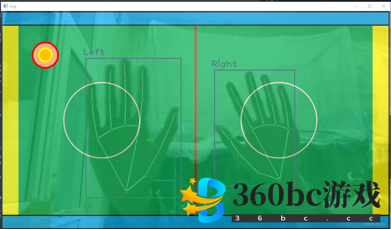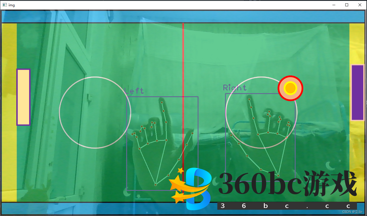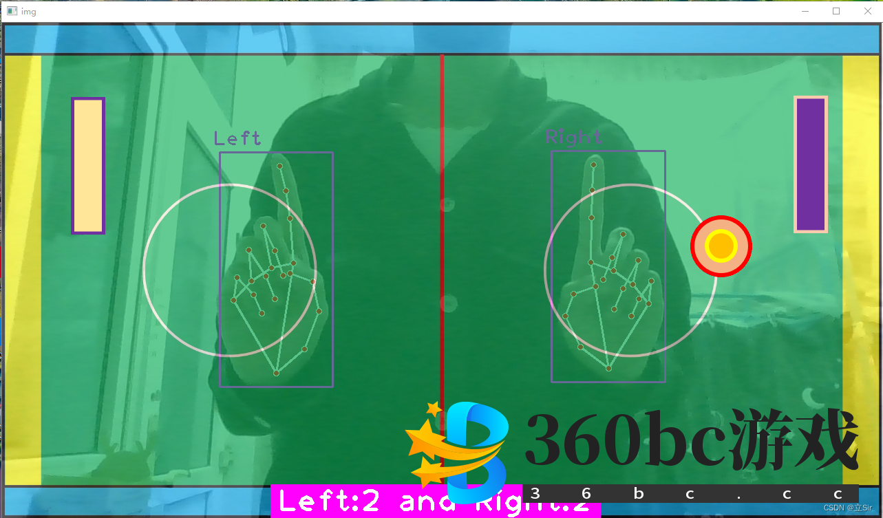 大家好,今天和各位分享一下如何使用 mediapipe+opencv 制作桌上冰球的交互式小游戏。先放张图看效果。 规则如下:左手控制白色球拍;右手控制紫色球拍;球拍只能上下移动;红色圆形就是冰球;球碰撞到上下两侧的蓝色边框,和两侧的球拍就会反弹;如果球进入了黄色区域,游戏结束;下面的粉色计数板,记录左右两侧各击球多少次。