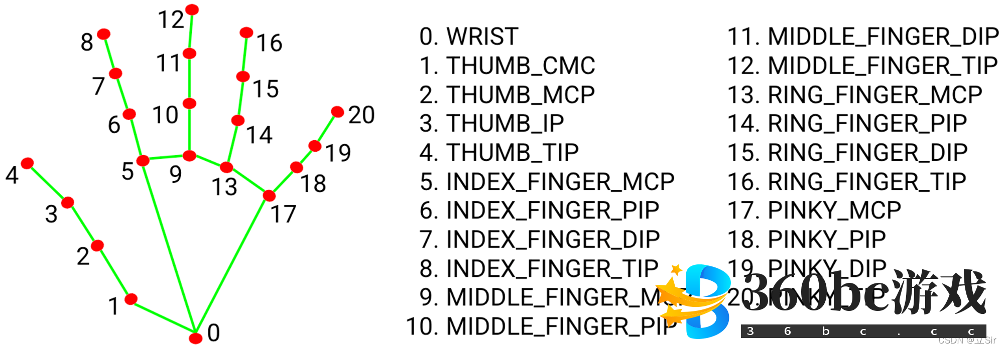 (1) cvzone.HandTrackingModule.HandDetector() 手部关键点检测方法 参数: mode: 默认为 False,将输入图像视为视频流。它将尝试在第一个输入图像中检测手,并在成功检测后进一步定位手的坐标。在随后的图像中,一旦检测到所有 maxHands 手并定位了相应的手的坐标,它就会跟踪这些坐标,而不会调用另一个检测,直到它失去对任何一只手的跟踪。这减少了延迟,非常适合处理视频帧。如果设置为 True,则在每个输入图像上运行手部检测,用于处理一批静态的、可能不相关的图像。 maxHands: 最多检测几只手,默认为 2 detectionCon: 手部检测模型的最小置信值(0-1之间),超过阈值则检测成功。默认为 0.5 minTrackingCon: 坐标跟踪模型的最小置信值 (0-1之间),用于将手部坐标视为成功跟踪,不成功则在下一个输入图像上自动调用手部检测。将其设置为更高的值可以提高解决方案的稳健性,但代价是更高的延迟。如果 mode 为 True,则忽略这个参数,手部检测将在每个图像上运行。默认为 0.5 它的参数和返回值类似于官方函数 mediapipe.solutions.hands.Hands() MULTI_HAND_LANDMARKS: 被检测/跟踪的手的集合,其中每只手被表示为21个手部地标的列表,每个地标由x, y, z组成。 MULTI_HANDEDNESS: 被检测/追踪的手是左手还是右手的集合。每只手由label(标签)和score(分数)组成。 label 是 'Left' 或 'Right' 值的字符串。 score 是预测左右手的估计概率。 (2)cvzone.HandTrackingModule.HandDetector.findHands() 找到手部关键点并绘图 参数: img: 需要检测关键点的帧图像,格式为BGR draw: 是否需要在原图像上绘制关键点及识别框 flipType: 图像是否需要翻转,当视频图像和我们自己不是镜像关系时,设为True就可以了 返回值: hands: 检测到的手部信息,由0或1或2个字典组成的列表。如果检测到两只手就是由两个字典组成的列表。字典中包含:21个关键点坐标(x,y,z),检测框左上坐标及其宽高,检测框中心点坐标,检测出是哪一只手。 img: 返回绘制了关键点及连线后的图像 (3)cv2.addWeighted() 图像融合 将两张图像按一定比例融合在一起,需要两张图像的size和通道数相同 两张图像按一定比例融合: cv2.addWeighted(图像1, 权重1, 图像2, 权重2, 亮度偏置) 相当于 y = a x1 + b x2 + c,其中 a、b 代表权重,c 代表亮度上提亮多少 首先 cv2.imread() 中的参数 cv2.IMREAD_UNCHANGED 是指用图片的原来格式打开,包含Alpha通道。即以不改变图片的方式打开,图片是彩色那么读进来就是彩色,图片是灰度图那么读进来就是灰度图,读进来的图片的shape如下: