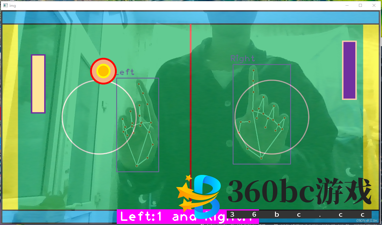 这一部分主要完成三项工作,第一是球拍击打到球,球需要反弹;第二是如果球进入黄色区域,游戏结束;第三是左右侧击球得分计数器。 (1)球拍击球 看到代码中的第(5)步,ballpos 代表球的左上角坐标(x,y),100 < ballpos[0] < 100+w1 代表球到了球拍横坐标区域范围内部了,y1 < ballpos[1] < y1+h1 代表球的y坐标在球拍y坐标内部,这时表明击球成功,speedx = -speedx 只改变沿x轴的速度方向,不改变沿y轴的速度方向。 (2)球进黄区,游戏结束 if ballpos[0] < 50 or ballpos[0] > 1150,如果球图片的左上坐标的 x 坐标,在黄区边缘,整个程序退出。当然也可以做一个游戏结束界面,我之前的博文里也有介绍,我偷个懒不写了。 (3)计数器 首先定义个变量初始化记录左右侧的击球次数 score = [0, 0],如果有一侧的球拍击中球,那么对应该侧计数加一。 上面代码是掌心控制球拍,这里改成食指指尖控制球拍中点移动。 效果图如下: