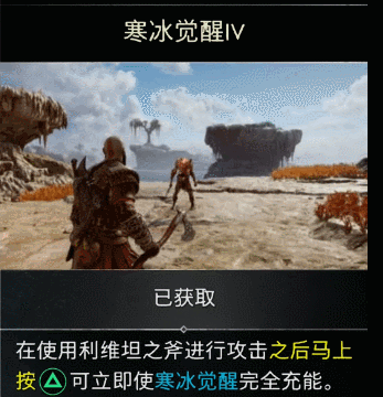 长矛拥有和另两把武器一样完整的技能树 此外,三把武器还不约而同地追加了“攻击陷入异常状态的敌人时提升威力”的设计,比如说,你用冰属性的利维坦之斧可以对进入灼烧状态的敌人造成更多伤害,混沌双刀和长矛亦然。 这个设计显然是在鼓励玩家主动在战斗中切换武器。美中不足的是,如果设计一个“易武攻击”,我肯定会更加乐意主动切换武器的;而现在,直到通关,我基本都是用(我认为)手感最好的斧头撸遍了大部分BOSS。 *存在着能发挥更高操作上限的“红刀” 在《战神5:诸神黄昏》,手持利维坦之斧时只要长按“△”,就能立刻为武器添加冰霜属性附魔,为下一次攻击提升威力和冰冻累积值(混沌双刀和长矛的“△”也都有各自效果)。这个技能在相当长的流程里都被我视为鸡肋,然而在武器升级之后,进阶技能中居然出现了“一次攻击后按下△可以立刻附加冰霜属性”的设计。