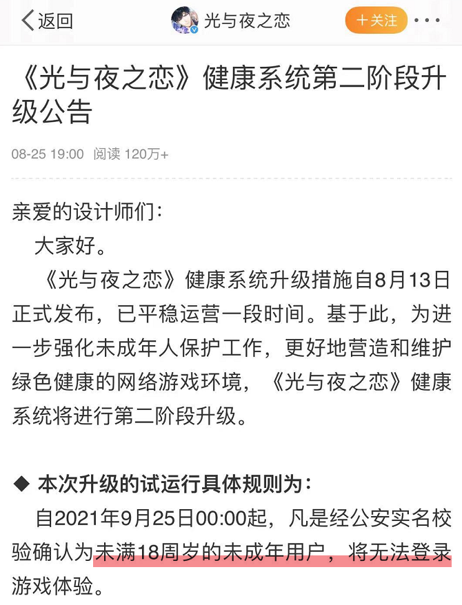这款游戏 6 月 24 号上线, 8 月初开始禁止未成年用户注册,昨天宣布从 9 月 25 开始禁止未成年用户登录。