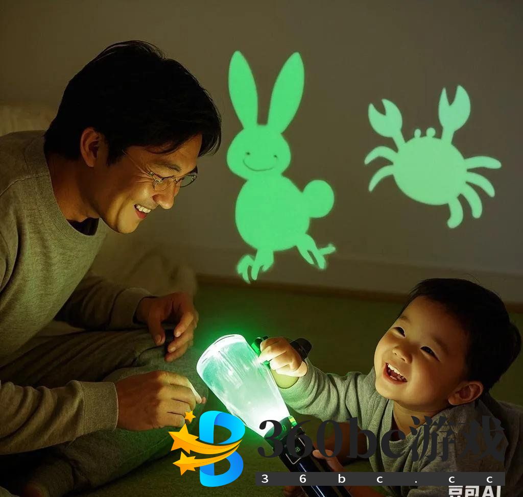 晚上关掉大灯,用手电筒在墙上照出一片光影舞台。