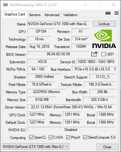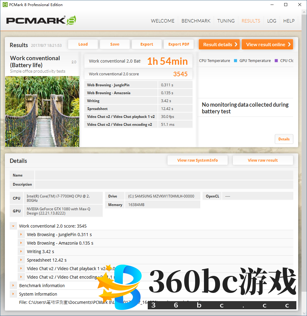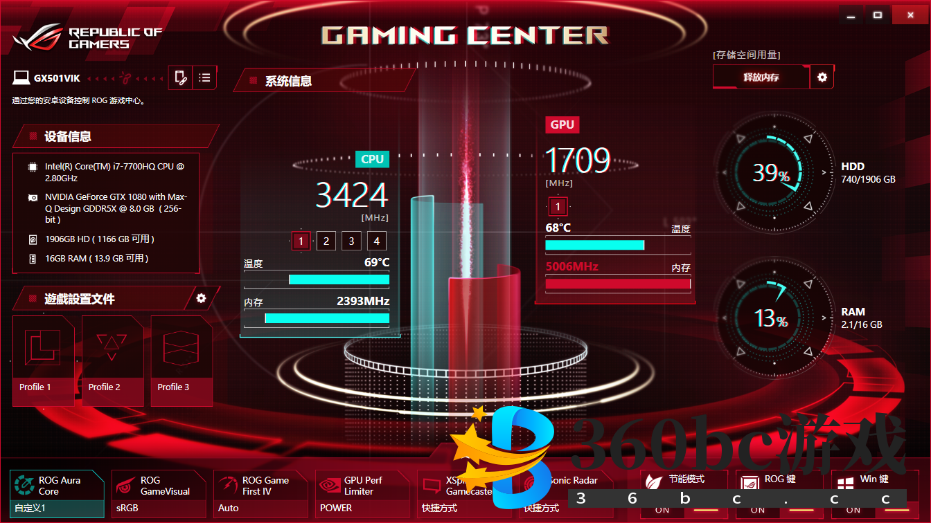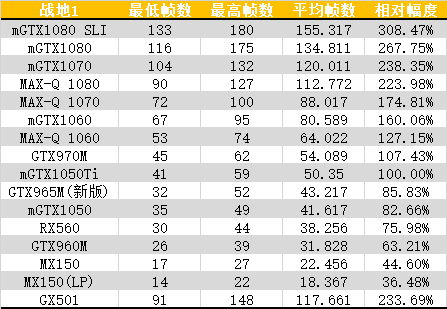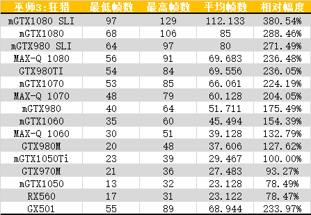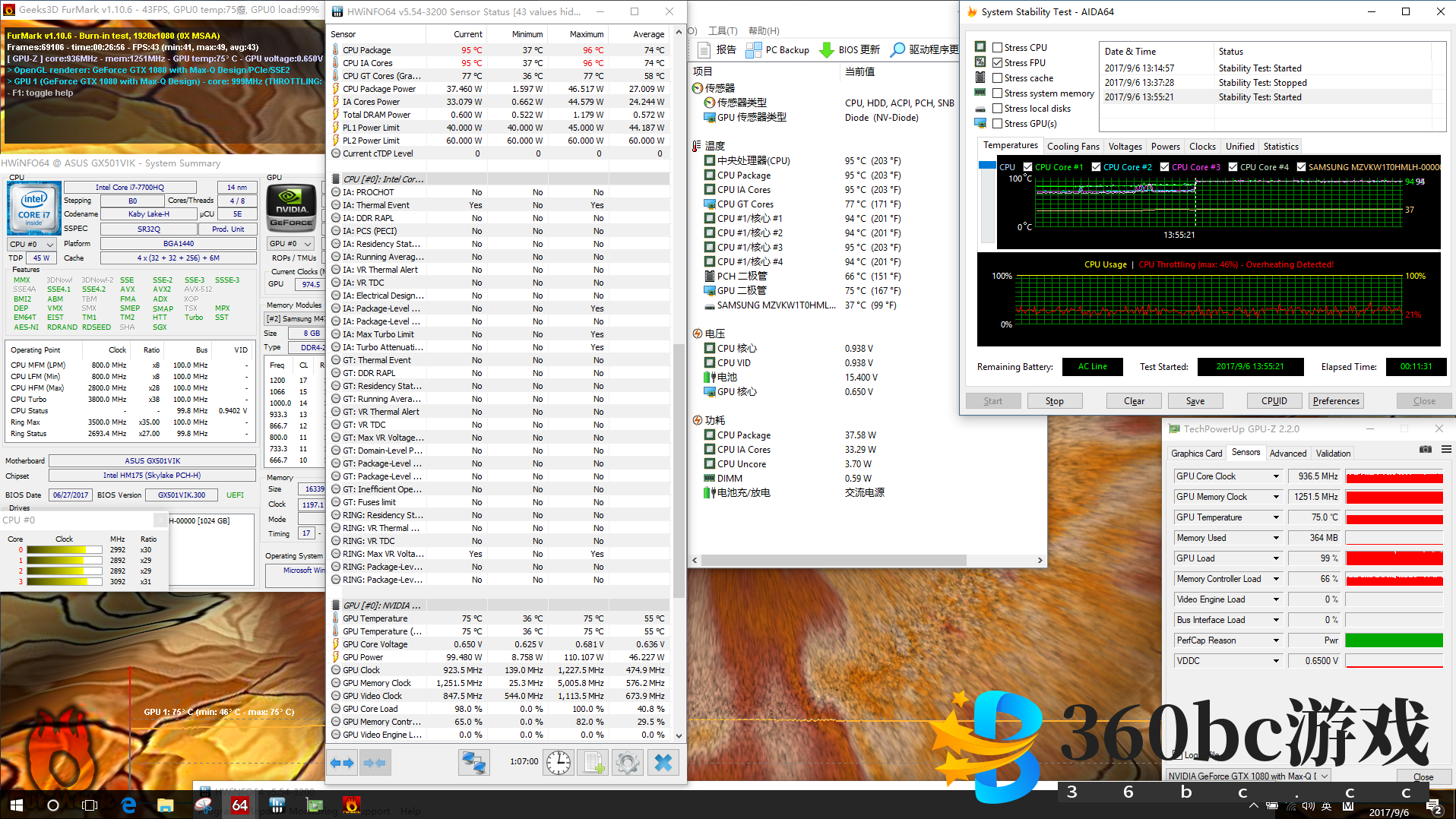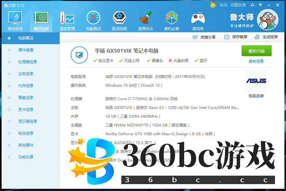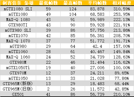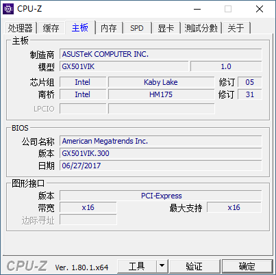 ![]() ![]() ![]() ![]() 笔吧评测室的评测为原创文章,转载时请标明出处和作者,欢迎大家的转载。 PS:图片点击即可放大 目录 【0】视频 【1】简评 【2】配置&参数 1.CPU 2.显卡 3.主板 4.内存 5.硬盘 6.电池 7.官方软件 8.屏幕 【3】性能 1.CPU&内存 2.显卡 3.硬盘&其它 【4】游戏 1.巫师3:狂猎 2.刺客信条:枭雄 3.古墓丽影:崛起 4.战地1 5.泰坦陨落2 6.看门狗2 7.量子破碎 8.幽灵行动:荒野 9.质量效应:仙女座 【5】散热&评价 0.待机 1.CPU烤机 2.GPU烤机 3.CPU+GPU双烤 4.游戏温度 5.表面温度 6.散热模块 7.小结 【6】拆解 【7】其它测试 1.功耗 2.噪音 3.续航 【8】总结  【笔吧评测室】轻薄与性能的完美结合?华硕玩家国度GX501VI评测_数码_科技_bilibili_哔哩哔哩https://www.bilibili.com/video/av15350778/视频部分可以直观的看到整机的外观和外设效果,并且简单介绍了各方面的参数和性能,一般的消费者观看视频即可了解到绝大部分的信息。欢迎大家在视频中吐槽,我们会根据视频留言逐步改善内容,使得视频更加完善,逐步取代图文的内容。 本章是为初学者以及某些不愿意详细了解评测的人士准备的。不过,这类简短的总结或多或少会夹杂笔者的主观看法在其中,并非客观的描述机器的特点,建议有能力者将整体评测浏览完毕,以消除部分主观的因素。 PS:本节采用评分的方式来展现不同方面上机器的表现,★为1分,☆为0.5分。评分范围0-5,意味着大部分机器都只有3分左右,表现很差就是0分,只有很出色的才有接近5分的可能。 再次谨记,这是主观评价,无法和所有玩家的想法一致,本节评价仅供参考。 下面介绍配置和参数。 GX501是私模,为和硕设计和制造。ROG以往没有类似的横向产品,可能以后还会有更多超薄游戏本的设计。 此次评测的机器具体型号为Zephyrus GX501VIK,量产机。测试机为顶配,低配将显卡降为MAX-Q 1070,并且固态容量有所缩减。海外版有内存为24GB的版本。 主要机器参数: ![]() 接口分布: ![]() PS:USB3.1 Gen1(TypeA)就是一般大家所称的USB3.0,由于最新规范中将3.0说法并入3.1中,很多厂商都开始玩起了文字游戏,只要注意Gen1还是Gen2就可以避免被误导。TypeA和TypeC也只是接口形状变化,和速度快慢无关。尤其要注意TypeC的宣传,此接口既可以是3.1也可以是3.0甚至2.0,而支持DP视频输出以及雷电3都是可选配置,TypeC≠USB3.1+雷电。 GX501的厚度是亮点,但也因为它,失去了很多拓展性。外部接口除了USB外,有线网卡和SD卡插槽都没有,内部仅一个M.2固态插槽和一个内存插槽。 鲁大师硬件参数截图 ![]() 鲁大师识别出了品牌和型号,准确无误。 ![]() i7-7700HQ,七代Kaby Lake架构,BGA封装不可更换。四核八线程,支持Intel睿频加速技术,主频2.8GHz最大睿频3.8GHz,L3缓存6MB。14nm制程,热设计功耗45W。7700HQ相比6700HQ提升了0.2GHz的主频,睿频提升了0.3GHz,其他似乎没有变化。 ![]() HWINFO截图,CPU是正式版产品,封装为BGA1440,S-SPEC为SR32Q,步进B0,最低倍频8x。 ![]() AIDA64里的CPUID截图,可以看到睿频为38x/36x/35x/34x,刚好都是比6700HQ多3个倍频。短时睿频功耗限制60W,持续时间28秒,长时睿频功耗限制45W,软件显示这些数值是Unlocked,说明可以用XTU解锁CPU功耗。 ![]() XTU信息,这是Intel的官方调节工具,可调节很多CPU参数,甚至内存参数。GX501无法调节倍频但可以调节电压和功耗限制,其中电流限制默认为68A。 ![]() GX501的独显型号为GTX1080 with Max-Q Design,8GB显存(镁光颗粒)。厂商标识为ASUS(1043),这就是华硕的设备ID。默认频率1227mhz,boost频率为1366mhz,显存频率等效10008mhz。显卡核心采用GP104核心,启用20组SM共2560SP,显存控制器有4组,为256BIT。Max-Q显卡并不是全新的核心,这是一种设计方式。按照官方说法,Max-Q ![]() MAX-Q 1080的电压频率截图,最高boost频率为1708.5MHz,满载核心电压为0.9V。最大频率比标准版低了约200MHz,不过核心电压也降低了很多。 ![]() CUDA-Z截图,这里显示了GPU有关CUDA的详细参数。 ![]() NvidiaInspector截图,这里可以看到独显(N卡)的某些其他信息,比如可超频范围,电压调节范围,高温降频线和TDP控制阀等。MAX-Q 1080不可解锁TDP控制阀,降频线为91℃。MAX-Q 1080和标准版M1080一样,是解锁超频范围的。 ![]() 主板信息,制造商显示为ASUSTeK,模型为GX501VIK。芯片组为Kaby Lake,PCH是HM175,BIOS类型为AMI,日期2017-6-27,版本GX501VIK.300。 ![]() AIDA64中的北桥信息,Intel早在二代酷睿i系列就将北桥整合进CPU中,主板上已经没有实际意义上的北桥了。北桥的主要作用是负责和内存的通讯和PCIe中显卡的通讯,核显的通讯也在北桥中。 从显示信息上看,7代标压U原生支持DDR4-2400(实际6代也支持),机器最大支持64G内存即四个插槽(实际只有1个),支持VT-d(当然也支持VT-x),核显已禁用,独显MAX-Q 1080占用x16带宽。 ![]() 南桥信息,实际上Intel的新酷睿平台也将部分南桥的功能整合到CPU中,现在主板只有PCH,只是一般玩家还在称呼其为南桥,低压U现在连PCH都搬了进来,只是目前还没有像核显那样达到完全融合。PCH集成SATA控制器,此外还有USB控制器等,PCIe中占用几条来实现新功能,比如无线/有线网卡等。 PCH的制程落后1代,是22nm,TDP 2.6W,标压处理器没有将PCH集成在CPU上。HM175似乎功能上和HM170完全一致,只是后者不支持7代U。这里还可以看到GX501无线网卡采用的是英特尔8265AC。 ![]() 机器自带的内存为双通道DDR4 2400MHz,时序为17-17-17-39@2T。 ![]() 内存品牌为三星,单条容量8GB,默认频率2400MHz,生产日期16年第50周。还有8G内存为