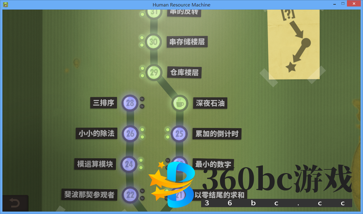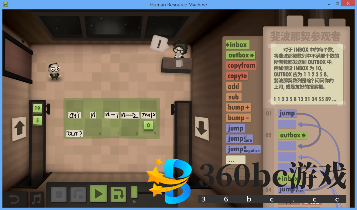 饥荒(don't starve) 很好玩,特别的小游戏。 目的只有一个:尽可能活的时间长。生存过程中可以收集时间传送器的部件,组合完成后传送到下一幕。一共有4幕,最后结局略那啥。。自己玩吧 ![]() ![]() - 1. 肉食男孩,「super meat boy」。 横轴 ACT,最早在 XBLA 上的独立游戏,有 PC 版本。 手感爽爆,非常难,但是非常耐玩,而且非常非常好玩,每天都要打一会儿才去睡。 ![]() ![]() 2. 「Limbo」 浓烈风格化的美工,想象力、好点子、无处不在的好细节。 ![]() ![]() 3. 「FEZ」 有趣的游戏机制,讨喜的画面风格。 游戏呈现的是一个二维和三维空间交错的世界,维度转换时「咻的一下」,那种仿佛有质感的细节实在快感满点。 当「获胜」这种事情变得不那么重要,你要做的,就是慢慢体会作者的灵魂,JUST A JOURNEY. ![]() ![]() 4. 我的世界,「MineCraft」 想象力有多远,MC 就有多远。 心有多大,MC 就有多大。 ![]() ![]() 独立游戏是个非常有趣、非常有意思、并且需要细细体悟的领域。 感兴趣的可以了解下电影 独立游戏大电影 Indie Game: The Movie(豆瓣),你也许会对游戏这项第九艺术,有一些思考。 - 必须安利一个最近玩的pc单机游戏《人力资源机(Human Resource Machine)》,它是 @马可菠菜和 @RainFool都提到的黏黏世界那家公司Tomorrow Corporation出的游戏。 这游戏主要是干嘛呢,就是教你编程,简直是挑逗程序猿休闲利器。 游戏的大概玩法是,使用拖放命令来指导人类办公人员来解决老板布置的问题。你解开一个难题,就能升级到公司大楼的下一层上,然后解决另一个问题。每层代表一年的时间。 每层会有大波箱子(代表数据),左边有个收件箱,右边有个发件箱,我们要做的就是让办公人员提交正确的箱子(一次一个),而且必须用正确的顺序。左右中间还有几个槽,可以储存一下箱子留着后面再用。 一开始只有两条指令,到最后会开放11条指令,就是很简单的汇编指令。游戏中每一层除了完成任务外还可以挑战两种奖杯,一是最少的指令数,二是最少的运行次数。如果要是再加一种最少的槽使用数估计就更烧脑了。 发几张截图 一进去就是熟悉的画风 ![]() 已经干到了36层 ![]() 有些关卡难度还不小,奖杯都拿不到 ![]() 这是任务关卡,这关是斐波那数列。最右边上方是关卡说明,说明下方是自己写的代码区域,然后左边紧挨着的是可用的指令类型。 最下方没错就是中止、回到上一条指令、执行和单步执行下一条指令和执行速度。可以Debug哦。 图下方是我凑得代码,嗯,这关是一个奖杯都没拿到。 ![]() -- HUMAN RESOURCE MACHINE PROGRAM -- JUMP b a: OUTBOX b: c: d: INBOX JUMPZ a COPYTO 0 COPYFROM 9 COPYTO 1 COPYTO 2 COPYTO 3 BUMPUP 1 COPYTO 2 e: COPYTO 5 COPYFROM 0 SUB 5 JUMPN d COPYFROM 5 OUTBOX COPYFROM 0 SUB 1 JUMPZ c COPYFROM 3 ADD 2 COPYTO 4 BUMPUP 1 COPYFROM 2 COPYTO 3 COPYFROM 4 COPYTO 2 JUMP e (责任编辑:蚂蚁团队) |