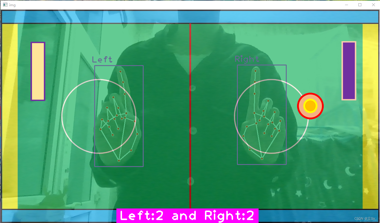 大家好今天和各位分享一下如何使用 mediapipeopencv 制作桌上冰球的交互式小游戏。先放张图看效果。 规则如下 左手控制白色球拍 右手控制紫色球拍 球拍只能上下移动 红色圆形就是冰球...