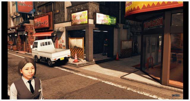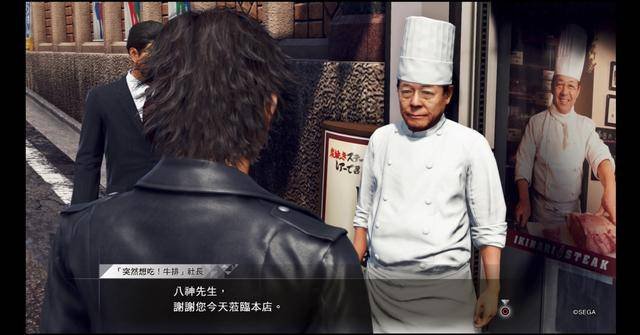 “游戏中还有一些真人客串的演员,比如这位店长” 就是这么一位自带“聚光灯”的侦探有时还得完成跟踪,寻人,伪装潜入等操作。那么我们接下来聊聊侦探方面。 侦探方面的问题是节奏很不连贯,每个系统每个系统之间都是分割开的。这里主要说一下需要经常用到的跟踪和追逐两个部分。跟踪的部分是很旧式的设计,跟踪途中设计了很多“隐蔽点”,你走到有蓝色光柱的地方就是隐蔽。追逐的部分是一般的QTE系统,没什么好说的,中规中矩。