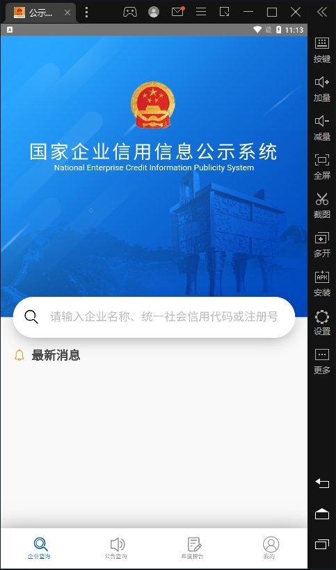 国家企业信用信息公示系统电脑版是由国家市场监督管理总专门为有需要进行企业信息查询用户们提供免费的全国企业、农民专业合作社、个体工商户等市场主体信用信息公示和查询服务的软件,其是基于电脑上的安卓模拟器进行运行操作的。在查询操作方面,用户只需要在软件中输入名称或注册号进行查询,并且系统支持按名称的关键词模糊查询,但需要注意的是对于无企业备案等无效的查询条件,将不会显示查询结果。 同时软件中会及时公示最新的《中华人民共和国政府信息公开条例》、《企业信息公示暂行条例》等法律法规、规章的有关规定,让查询用户和企业主体用户能够依法依规进行查询和公示。另外软件中还会及时公示相关涉嫌违规企业的信息公告,方便用户们及时看到,以免给自己带来相关经济利益损失,有需要的用户可以在本站免费下载使用。