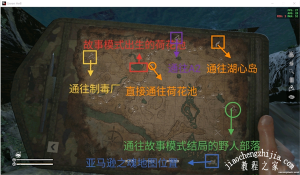 最近丛绿色地狱游戏新上线了全新地图亚马逊之魂,很多老玩家纷纷回去体验,但是有不少玩家都找到亚马逊之魂的入口在哪。其实打开亚马逊之魂的地图通道有4个,玩家只要细心点就能看到,下面教程之家网为大家分享亚马逊之魂入口的地图位置,感兴趣的玩家快来了解下吧! 近期官方更新了绿色地狱故事模式的前传:亚马逊之魂,而在更新之前生存模式就已经打开了进入亚马逊之魂地图的通道。 游戏中有四个进入新地图的位置,具体如下。 位置1