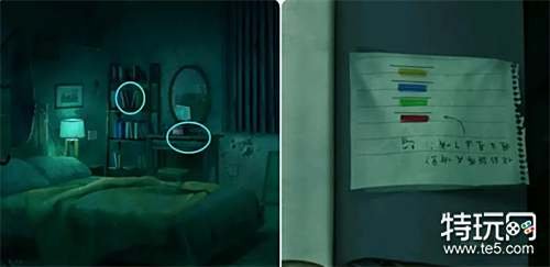 观察墙壁上的五幅图画(注意它们的颜色),然后回到主卧结合纸条上的提示(顺序)输入颜色密码紫绿橙绿蓝打开梳妆台的抽屉获得照片。