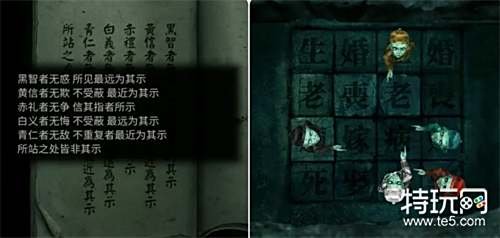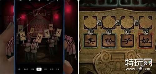 以申墨卿视角进入后面的纸人庙,通过手机观察纸人给的提示(相同颜色部分组成汉字)来到宗祠外面打开门口的箱子。 注:这里可以通过点击太极图调整汉字的位置,根据颜色来就是矣替子娘。