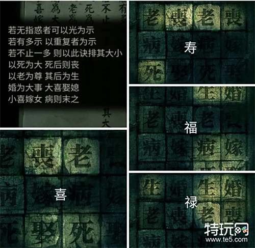 通过来回切换视角观察喜寿禄福四个字对应在暗室里的提示,然后结合《寿祭》上的文字提示获得密码死丧生死。 注:《寿祭》上的规则前面大于后面,即重复者为示大于下面排大小的口诀,所以下面来具体分析这四个字对应的文字密码。 喜字:无重复者取排大小的口诀,第一个口诀“以死为大,死后则丧”,所以喜字对应的是死字。 寿字:“若有多示,字重复者为示”,以重复字数多的那个为密码,但是寿字有两个重复字老和丧,再取口诀“以死为大,死后则丧”,虽然有死字,但是规则在前者大,所以在老和丧中取丧字。 禄字:有重复者,取生字。 福字:无重复者,取口诀“以死为大”,所以福字对应的是死字,结合起来就可以得到密码死丧生死。