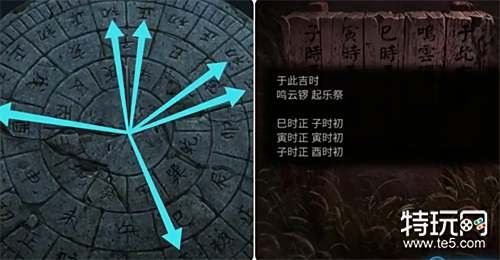 观察日晷,然后结合戏台处木牌上的云锣吉时获得敲击云锣的正确顺序甲庚丁乙辛壬,接着用树枝敲击云锣激活乐师石俑。