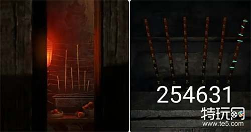 回到外面点击香炉,根据之前获得的提示把握时机用火柴按顺序点燃香柱,完成后在香炉上获得新的提示。 注:注意第一根香燃烧的位置,在它即将烧到上图所示的位置时按顺序点燃其它的香柱。