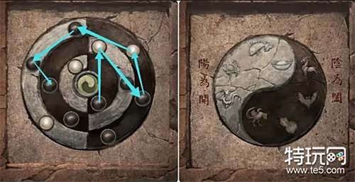 到外面将阴阳玉放在墙上的机关上,然后按上图的顺序点击按钮完成机关,接着观察出现的新提示。