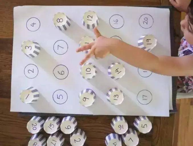 纸杯底部数字和圈中数字对应,锻炼幼儿的反应能力,在玩的同时学数学,有心的家长还可以玩出多种花样。 3. 推球游戏