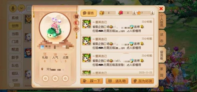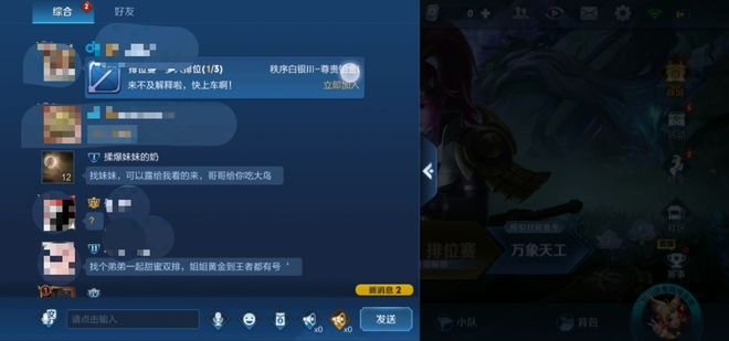未成年人账号下,QQ飞车组队页面 另外,在“和平精英”中也有玩家通过头像引流赌博网站。而“梦幻西游”的成年人游戏账号在世界频道还曾出现疑似赌博游戏代理招募广告。 社交板块内容露骨,未成年人账号可见“约炮”言论 随着各款游戏社交属性的加强,玩家在聊天社交板块的交流也越来越活跃。调查期间,南都记者通过未成年人账号进入游戏的聊天频道,曾看到露骨聊骚、低俗表情包、售卖电子烟、网恋奔现、约炮等不利于未成年人健康成长的信息。 如在“王者荣耀”“和平精英”“QQ飞车”“QQ炫舞”等多款游戏的聊天频道,“聘老公,可现”“cpdd”“可奔现,可语聊可视频”等言论随处可见,部分甚至极度低俗,如“找个已婚的处对象”“大号带吃鸡,晚上约个*”“找cp要未成年的”“找个女儿含****”等,这些信息均可在报料人黄先生年仅8岁儿子的游戏账号中看到。 另外,在“王者荣耀”的综合聊天页面有用户发布的色情露骨内容,如一名为“揉爆妹妹**”的用户在聊天页面中刷屏称“找妹妹,可以脱给我看的来,哥哥给你吃**”。南都记者试图举报该用户的不良言论,但聊天页面无渠道,仅能在用户主页举报昵称,也无法举报特定言论。