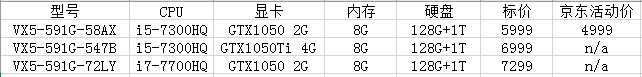 注:本文已过时,不再具有较好可参考性! 【笔记本深度导购、笔记本进阶使用等问题,欢迎来作者的“值乎”提问】 值乎 - 说点儿有用的 距离上一篇专栏发表已经过去一个月了,终于在一周前,Kaby Lake的标准电压i5/i7与移动版GTX1050/GTX1050Ti同时解禁,早已磨刀霍霍的各大pc厂商也一股劲发布了准备好的新品,中端游戏本市场的竞争大幕就此拉开。 本篇文章将主要针对一线品牌已发售或即将上市的机型,进行逐一分析,简单列举各个机型的优缺点,并在文末加以总结。 很多人可能对新处理器和显卡的性能不太了解。这里用几张条形图简明直观地表现本代新硬件对比上一代的提升幅度: CPU(以i5-6300HQ为100%基准),i5-7300HQ比i5-6300HQ提升6%,i7-7700HQ比i7-6700HQ提升7%,性能提升全部来源于频率的提升,用一个词概括:“挤牙膏”。 ![]() 显卡(以GTX960M为100%基准),移动版GTX1050比GTX960M提升30%,略弱于GTX965M。移动版GTX1050Ti比GTX960M提升近一倍,比GTX965M提升27.5%,稍强于GTX970M。 特别要注意:现在的大型游戏对显存的需求都很高,一些机器只给GTX1050搭载了2GB的显存,玩看门狗2、古墓丽影升起等大作时可能遇到显存不足的问题——表现为游戏掉帧。 1、宏碁 暗影骑士3——已开售 ![]() ![]() 尽管从命名方式上看是暗影骑士2的后代,但从图片可以很明显看出,暗影骑士3的模具与暗影骑士2有着巨大差别。实际上,宏碁在暗影骑士3上放弃了之前使用的VN7机型,改用全新设计的VX5机型,外观也由VN7的商务轻薄风转为当下市场流行的"跑车"游戏风。 VN7机型并没有被宏碁放弃,在CES2017上宏碁推出了搭载GTX1050显卡的新款VN7,同时还带来了与本代Alienware相同的Tobii眼球追踪技术;但是价格较高,据digitaltrends的消息,国内价格起步价可能高达9000元,已经脱离了“性价比”游戏本的范畴。 ![]() 这次暗影骑士3京东首发,宏碁在最低配的i5+GTX1050机型上打了一个非常给力的抢购价:4999元,性价比几乎可与神舟等二线品牌媲美。 全线自带8G内存和128G固态点个赞,用户可以到手即用,不必担心内存吃紧或系统卡顿。