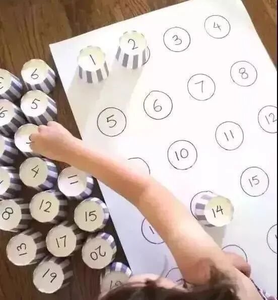 准备一些带盖的瓶子,取少量不同气味的调味料分别倒在瓶子内。 让孩子依次闻一闻每瓶散发的气味,告诉其名字。过一段时间后,再让孩子闻一闻,并问这是什么。 除了调味料,其他带有(健康)气味的东西也可以做同样的游戏,锻炼孩子对气味的分辨能力。 ![]() 「 数字赛道」 男孩子喜欢玩赛车,把数字变成赛道,让他更直观了解数字的形状。 ![]() 「纸杯对应」 纸杯底部写上数字,找到白纸上对应的数字,对号入座。 ![]() 「形状分类」 在墙上画好各种形状,然后让孩子分类粘贴。