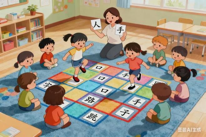 1. 字卡抱抱 游戏准备:5-6 张印有简单独体字(如 “人、口、手、日、月”)的字卡,字卡尺寸约 15cm×10cm,颜色鲜艳。 游戏玩法:家长或老师出示一张字卡,大声读出字音,比如 “这是‘手’”,同时伸出手做动作。幼儿跟着读,然后跑到字卡前抱一抱字卡,再模仿 “手” 的动作。轮流进行,直到所有字卡都被 “抱抱” 过。 2. 水果字宝宝 游戏准备:苹果、香蕉、橘子等常见水果实物,以及对应的字卡(“果、蕉、橘”)。 游戏玩法:先出示水果,让幼儿说出名称,再拿出对应的字卡,告诉幼儿 “这是‘果’,苹果是‘果’”。把字卡放在水果旁边,幼儿拿起水果时要同时拿起字卡读一读,比如 “我拿的是苹果,这个字是‘果’”。 3. 踩字过河 游戏准备:8-10 张写有幼儿名字中单个字(如 “小、明、红、华”)的字卡,铺在地上当 “石头”。 游戏玩法:告诉幼儿 “我们要过河啦,只能踩在有字的石头上哦”。家长或老师说出一个字,幼儿找到对应的字卡踩上去,边踩边读。可以故意说错,让幼儿纠正,增加互动趣味。 4. 动物字卡模仿秀 游戏准备:6-7 张动物字卡(“猫、狗、鸡、鸭、鸟”),搭配对应的动物图片。 游戏玩法:展示字卡和图片,告诉幼儿 “这是‘猫’,小猫喵喵叫”,同时学猫叫。幼儿跟着读字、学叫声和动作。然后随机抽出字卡,幼儿看到后立刻做出对应的动物模仿秀,比如抽到 “狗” 就 “汪汪叫” 并摇手当尾巴。 5. 字卡找朋友 游戏准备:4 对相同的简单字卡(如 “大、大、小、小、多、多、少、少”)。 游戏玩法:把字卡打乱散在桌上,家长和幼儿一起当 “找朋友” 的小侦探。每人每次翻一张字卡,若两张字卡相同,就欢呼 “找到朋友啦”,并一起读一读这个字。直到所有字卡都找到好朋友。