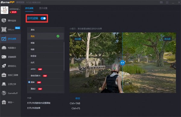 1、游戏内实时查看硬件状态 · 自定义勾选需要查看的硬件数据 · 多种游戏内监控模式可供使用 · 快捷键打开/关闭游戏内监控 · 自定义调整显示大小及刷新时间 2、实时桌面监测硬件数据状态 · 随心所欲调整桌面硬件监测显示位置 · 自定义勾选需要显示的硬件监测数据 · 多种个性化皮肤方案可供桌面显示 3、游戏内一键改善画面效果 · 不同游戏场景制定专属游戏滤镜方案 · AI游戏滤镜方案自适应游戏画面效果 · 快捷操作显示器显卡设置调整场景色彩 4、一键评测电脑硬件性能状况 · 硬件评测掌握电脑在游戏中的性能表现 · 配置预测电脑在不同游戏内的FPS帧数 · 压力测试当前配置在各种场景下的稳定性 · 智能AI超频将CPU提升至更高性能水平 5、实时推荐云顶之弈最新阵容 · 根据棋盘已有英雄实时推荐阵容 · 云顶之弈最新赛季最新阵容推荐 · 游戏内直接查看所需装备合成路径 · 一目了然英雄羁绊、种族、职业关系 游戏加加AI滤镜,根据当前游戏内的画面色彩和亮度,自动生成目标画质方案; AI明亮滤镜:游戏画面过于黑暗时推荐使用。 AI鲜艳滤镜:游戏画面过于暗淡时推荐使用。 AI暗淡滤镜:游戏画面过于艳丽时推荐使用。 AI均衡滤镜:适合大多数游戏场景。 游戏加加AI滤镜使用流程参考如下: 1、使用最新版本游戏加加;(前提开启游戏加加截图功能)