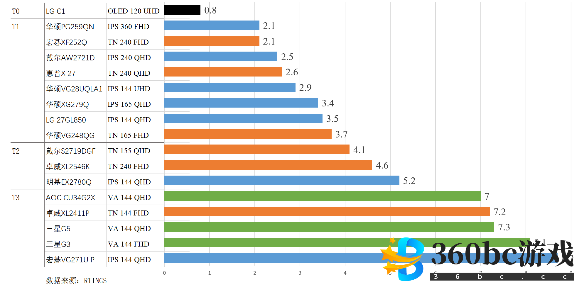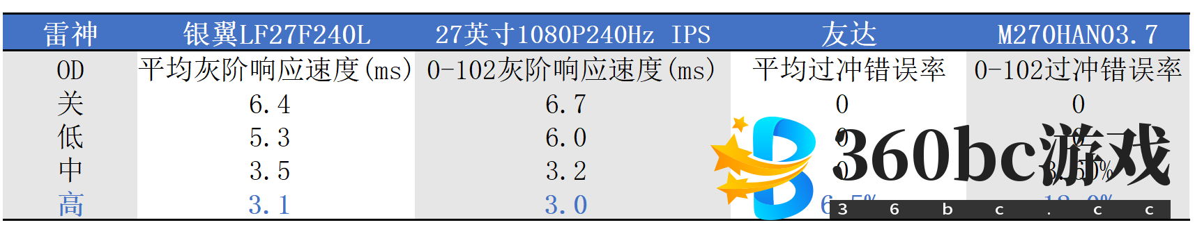 小米24.5 240Hz,被我认为是2021年最具性价比的240Hz IPS电竞显示器。可惜现在是2022年,今年的雷神银翼LF27F240L超越了小米24.5 240Hz。 银翼LF27F240L是一款27英寸、240Hz、友达3.7面板的IPS电竞显示器,目前售价1599。因为雷神的起名能力实在太差劲,我实在记不住“LF27F240L”这个名字,所以下文一律简称为“银翼240”。 为什么这台显示器很出色?主要原因是雷神这次非常用心,银翼系列和之前的产品在质量上完全不是一个档次。次要原因是有个叫做知乎彦祖的人参与了产品的后期改进,经过一次次改进后,它终于变得非常强大了。当然,最根本的原因是友达3.7面板很给力,而且这款产品的售价很低。 ![]() 省流助手:银翼240的响应速度比小米240Hz快0.3ms,对比度色域等参数比小米高一丁点,外观更加偏电竞,价格低很多。但是尺寸为27英寸,桌子太小的话可能不好放置。 我对"电竞显示器”的主观定义是:拥有高刷新率、高响应速度、低分辨率(1080P),专注于FPS和MOBA等竞技游戏的显示器。 与之相对的,我对“游戏显示器”的主观定义:拥有高刷新率、高分辨率,能兼顾各种类型的游戏,尤其是大型单机游戏的显示器。 不过,上述定义似乎有点问题:理论上1080P的电竞显示器应该在响应速度上超过2K/4K的游戏显示器,可是现在最快的IPS显示器反而是2K 240Hz而不是1080P 240Hz或1080P 360Hz。 尽管参数上被游戏显示器超越,但这并不意味着电竞显示器没有价值。1080P在某些时候可能反而是有优势的,比如低分辨率可以降低显卡负担,从而让游戏帧数更容易稳定在较高的水平。因而,FPS玩家还是偏向于选择1080P显示器,更有甚者会把分辨率降低到900P以获得更高帧数。此外,1080P 240Hz显示器比2K 240Hz便宜很多,后者的价格基本上在5000元左右,而前者一般不到2000元。 省流助手:和银翼2K 165Hz一样。 银翼系列的模具是雷神特别定制的,因此在颜值上堪称同价位产品中的顶级(之一)。我觉得银翼比小米好看,表妹对此表示反对。 关于尺寸,我要多说几句,我并不认为27英寸就不能做成FHD(1080P)。27英寸1080P是不是有颗粒感?完全取决于你和屏幕的距离,距离小了,24英寸2K也颗粒感,距离大了,32英寸1080P颗粒感也不明显。如果你觉得27英寸1080P有颗粒感,那请你把显示器稍微远离一些,使其在视野中和24英寸一样大。此外,在尺寸上,27英寸屏幕只比24.5英寸宽5cm,高3cm,二者的差距真的会有这么大吗? 在外观上,银翼240整体偏向于电竞风格,充满未来科技感。做工出色,细节把控较好。 ![]() 我特别喜欢银翼的支架底座,看起来科技感满满,而且比一般的底座更加稳定。但是不得不说的是,这种底座也有缺陷,就是对桌面空间占用比较大,玩家在FPS游戏中压枪时,大幅度移动的鼠标可能会碰到支架。 ![]() 背面是真的很好看,略微有点外星人的风格。尤其辨识度极高的升降旋转支架,好看,稳定,且实用。 ![]() ![]() 接口平平无奇是3个HDMI 2.0,一个DP 1.2 ,音频口以及(外置)电源输入口。不过,我依然不懂3个HDMI 2.0的意义。 ![]() 0-100%亮度都是DC调光 8bit+FRC。官方没有提色深,客服估计也不懂,你只需知道,银翼240Hz实测可以抖10bit就行。 银翼240自带出厂校色,拥有①超高的广色域覆盖率,②完美的色域切换能力,是1080P 240Hz显示器中的最强者!因而能够满足:不支持广色域的网游、小游戏以及支持广色域的大型单机游戏和HDR电影的需求。 默认模式下98% DCI P3覆盖率,比小米高1%,不过这点差距可以无视。 sRGB模式下是100% sRGB覆盖,而且色域范围控制得恰到好处,既不低于100% sRGB,也几乎没有明显超过sRGB的范围,完全几乎不会有任何过饱和的问题。此外,切换到sRGB模式后亮度不会锁死,可以自由调节。 ![]() 完美的色域切换表明雷神的色域限缩做的非常非常好,目前业内能把一两千块钱的显示器色域限缩做的这么好的厂家,只有两个:小米和雷神。其实,色域限缩并不是什么高深的技术,“恰好到处”的色域切换也不难。我也参与过一些显示器的色域调试工作,我的观点是:任何品牌,只要想做色域切换功能就一定能做出,而“恰好到处”的sRGB模式也只是个体力活,没有太多技术含量,只要多花时间就必然能调好。 其他品牌并不是没有能力做好色域切换,只是不愿意做罢了。 个人观点不服来辩: 色域切换是所有广色域覆盖率较高的游戏显示器所必备的功能,不然过饱和问题永远无法解决。恳请其他厂家把色域切换功能做进去,这个真的不难,也不要多少成本。请稍微尊重一下消费者吧!我自己不介意过饱和,但是真的有很多人会介意。 默认模式和sRGB模式的结果相似,亮度都是40-430nit,最大亮度下对比度为1470,日常使用的150-200nit亮度下对比度为1570。其对比度比一般IPS显示器高40%-50%,是1080P 240Hz IPS显示器中的最强者! ![]() 超高的对比度使其在显示暗处场景时能够比绝大部分IPS显示器更为出色,这对FPS玩家来说应该非常有用。暗处细节上的优势在电影中也能得到体现。不过这是友达3.7面板的功劳,不是雷神的。 根据电视机顶盒测试,银翼240的2%、5%、10%、25%、50%还是75%的HDR峰值亮度都为405nit左右,恰好符合HDR400的要求。 根据VESA DisplayHDR软件的测试,银翼240的10% HDR峰值亮度为480nit (该软件无法测试其他百分比的HDR亮度)。 两个测试的区别在于:机顶盒测试是由机顶盒(腾讯极光pro 4)通过HDMI线来传输HDR信号的,而软件测试是通过电脑显卡通过DP线来输出HDR信号。 全局背光,无控光