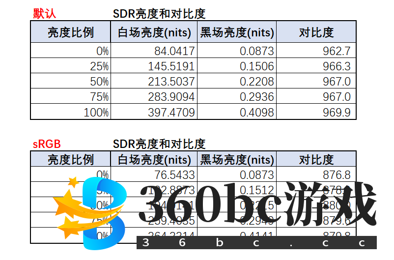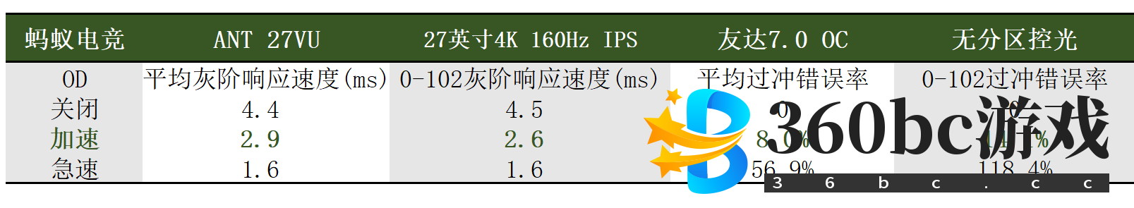 几个月前,蚂蚁电竞发布了27英寸4K 144Hz的ANT27VU,在当时就已经是性价比很高的4K 144Hz显示器。我还为此写了一篇评测文。 毅种循环:2999元=4K 144Hz+RGB灯,蚂蚁电竞ANT27VU评测不过当年的老款ANT27VU并不能称得上是性价比最高,因为同价位的KTC、雷神等品牌的4K 144Hz显示器也都很棒,ANT27VU相比他们并没有独特的性能优势,只是颜值稍微高一点点而已。 如今,新款的ANT27VU来了,从4K 144Hz的友达2.3面板换成了【原生4K 160Hz】的友达7.0面板(OC),响应速度翻倍,观感提升,实际上调教也更好了,价格却不变。这才是真正的“加量不加价”。 而别家的友达7.0还没有实装,这就使得ANT27VU一跃成为当今“性价比最高"的4K高刷显示器。毕竟,2699元的价格,就能带来接近当年LG“机皇”27GN950的体验,这还不香吗? 那么,看到这里。之前购买了 27VU的朋友会不会觉 得有点失落呢?其实DUCK不必,电子产品永远是早买早享受。况且2699元的价格是双11特有的,之后肯定会涨,我猜ANT27VU在活动后应该会回到3199的价位。这意味着,实际上新ANT27VU是比老ANT27VU贵的。 一言以蔽之,和老款ANT27VU一模一样。好了,我们进入下一章。 算了,为了避免有人说我偷懒或者云测,我还是重新拍一组照片吧。 正面辨识度很高,因为显示器底座长得像蚂蚁腿,而且非常非常大。 ![]() 从侧面看的话,支架简直大到离谱。这种大支架确实看起来非常有视觉冲击力,给人一种高端大气上档次的感觉。支架的做工极好,比同定位的KTC H27P22好了不止一个档次。 ![]() 当然,支架实在太大也会导致一般的小桌子根本放不下,所以,漂亮的支架也可能是“中看不中用”。 抛开实用性的话,不得不感叹,支架确实很漂亮,做工堪比ROG,说到ROG,我突然觉得蚂蚁电竞的支架就是在高度“借鉴”ROG。这个价位的4K高刷显示器能做到这种品质,我觉得必须要表扬。 ![]() 三面窄边框,不知道是不是错觉,边框似乎比老款要窄一丁点。 (下图是我女朋友兼助理拍的,还不错吧?) ![]() 背面三处LED灯,位于顶部和两侧,灯光颜色可以变化。背面左下是OSD摇杆和电源键,OSD操作非常流畅, ![]() 接口也比较齐全,2个USB-A扩展接口,可以通过USB-B和USB-C线来激活。USB-C口支持DSC,实测可以实现4K 160Hz 10bit输出,不过充电功率只有15W,并不能给笔记本反向充电。 DP 1.4接口支持DSC,可以实现4K 160Hz 10bit[1]。 HDMI 2.1应该不是满血,估计是32Gbps带宽,只能4K 144Hz 10bit。 ![]() 0% - 100%亮度都是DC调光,不闪屏 8bit+FRC,即抖10bit,实测无论是DP还是HDMI口都可以输出10bit图像。 软件级。415-455nm有害蓝光能量占400-500nm总蓝光能量的比值仅有60.2%,正常水平。 ![]() 默认模式94% P3覆盖率和95% AdobeRGB覆盖率,比友达2.3高2-3%的P3覆盖率。所以3A大作和主机游戏中都会有更好的表现,而较高的AdobeRGB覆盖率意味着它有望兼顾一些专业摄影设计需求。 可以切换到sRGB模式,sRGB模式下亮度不会锁死,好评! ![]() 默认模式白场亮度84~397nits,对比度基本在960-970,属于IPS中的正常水平。sRGB模式的亮度比默认模式低了大概10%,对比度也降低到880左右。 ![]() HDR下,亮度提高到467,而对比度提高到1180。这类显示器在不同明亮窗口占比下的亮度和对比度都差不多,所以我们只精确测量了10%的情况。没有像对待OLED和MiniLED显示器那样测所有明亮窗口占比的亮度。 ![]() 均匀性表现极好,快要达到专业绘图显示器的水平,超过至少90%的游戏显示器(或者说超过99%也不为过),大概是因为新面板确实非常给力。 ![]() 同样地,色准也非常棒,堪比专业绘图显示器。再结合前面提到的高AdobeRGB覆盖率、优秀的均匀性,我认为新款ANT27VU完全可以兼顾专业绘图设计。这是老款ANT27VU所不具备的特性。 ![]() 因为面板升级,观感也有所提升。友达2.3的那种“充满厚重时代感”的油腻观感不复存在,取而代之的是一种更加通透纯粹、更容易为人所接纳的“正常”观感。观感无法用数值来衡量,但是我认为观感提升就是新ANT27VU相比老ANT27VU而言最大的两个实质性升级之一(另一个是响应速度翻倍)。 ![]() ![]() 1080P 120Hz 4.4ms, 4K 60Hz 8.6ms 都属于游戏显示器正常水平。 新款ANT27VU的响应速度非常快,相当于老款的两倍,这是新款最大的提升之一,从根本性上改变了这款显示器的定位,使其从不适合FPS游戏变成适合FPS游戏。当然,这里说的“适合”是相对其他4K显示器来说的,实际上,最适合FPS游戏的永远都是1080P高刷新显示器而不是4K显示器,因为高分辨率会拖累FPS游戏的帧数。而FPS游戏恰好是帧数为王,画质则是次要的。 新款ANT27VU的最佳OD档位是【加速】档,响应速度2.9/2.6ms,逼近当代IPS显示器的极限水平。这意味着它在游戏中的拖影会非常少,所以非常适合FPS游戏。 ![]() 下图为1/125快门下拍摄的【加速】档飞碟图。可以看到,拖影极少,画面非常干净,并且完全没有因过冲错误造成的鬼影。拖影少是因为响应速度很快,而没有鬼影则是因为该档位下过冲率非常低(实际上应该也有,毕竟有8%过冲率,这是少到难以被肉眼和相机察觉到)。 ![]() DP线支持G-Sync compatible和FreeSync HDMI线支持支持FreeSync,但是G-Sync不一定能启用。我试了好几台电脑,RTX 3060和RTX 3060 Ti,但是用笔记本RTX 3050却能开启,以及朋友的RTX 3090也能。所以说,难道这个功能是随缘的吗? 多种风格的瞄准镜和计时器 OD开「加速」,FreeSync开启,亮度调到自己喜欢的程度。 HDR只在HDR游戏或者HDR电影中打开,平时不要开HDR;色彩模式用默认