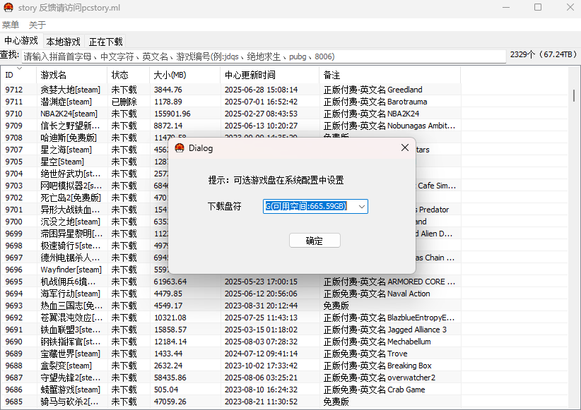 文末获取下载方式! 感谢您抽出 . . 来阅读本文 蘑菇游戏下载器是一款PC端单机游戏的下载器,一共有2329个游戏,67.24T!干干净净,没广告!正版付费、正版免费、完全免费、美服、台服……各种版本随便挑。 这个软件是绿色版,文末获取地址,无需安装,双击pcstory.exe即可运行! 第一次打开软件是需要进行配置的:下载游戏盘符最好选择非系统盘,要不然这六十多T的游戏真的遭不住! 设置好之后,就到软件的主界面了,软件支持搜索支持游戏名拼音首字母,中文名,英文名、游戏编号等方式 这款软件一共有2329个游戏,67.24T!还标注了文件大小、付费还是免费。 想要下载那个直接右击下载即可,可以打开游戏目录、修改路径、更新游戏、或者删除游戏。 下载速度测试最快能有3MB+(个人感觉速度不是很快) 所有下载的游戏都放在G:\mystream 目录,随便打开一个下载好的游戏目录,双击storygame.exe就可以开始游戏了! |