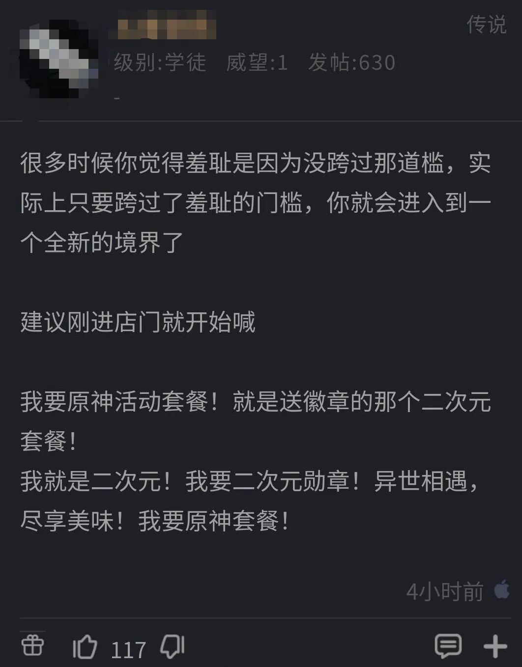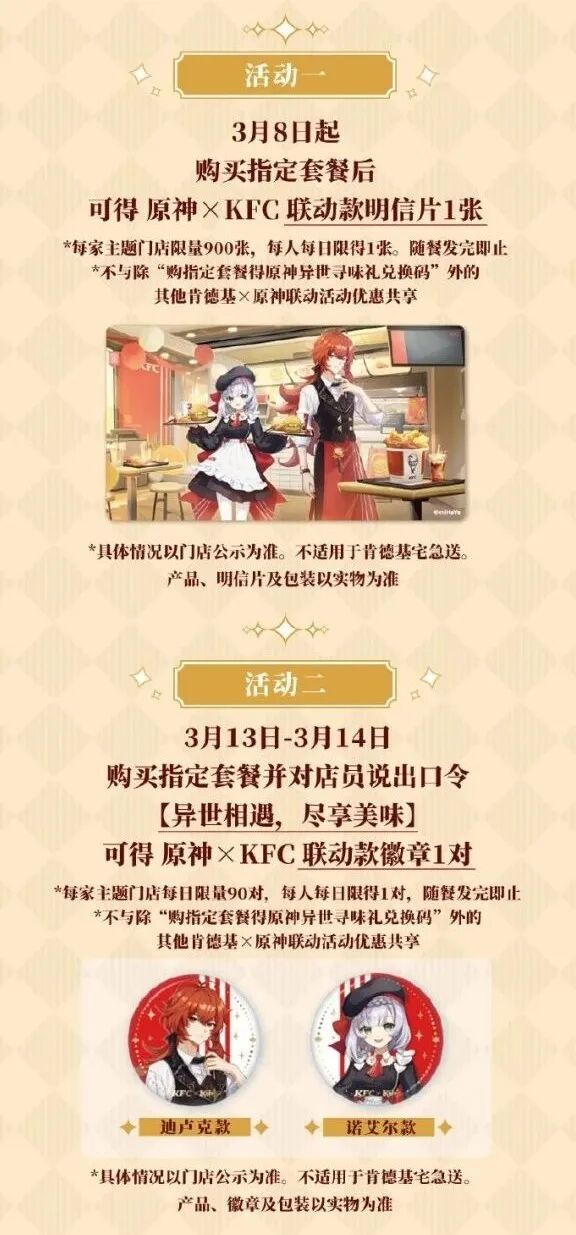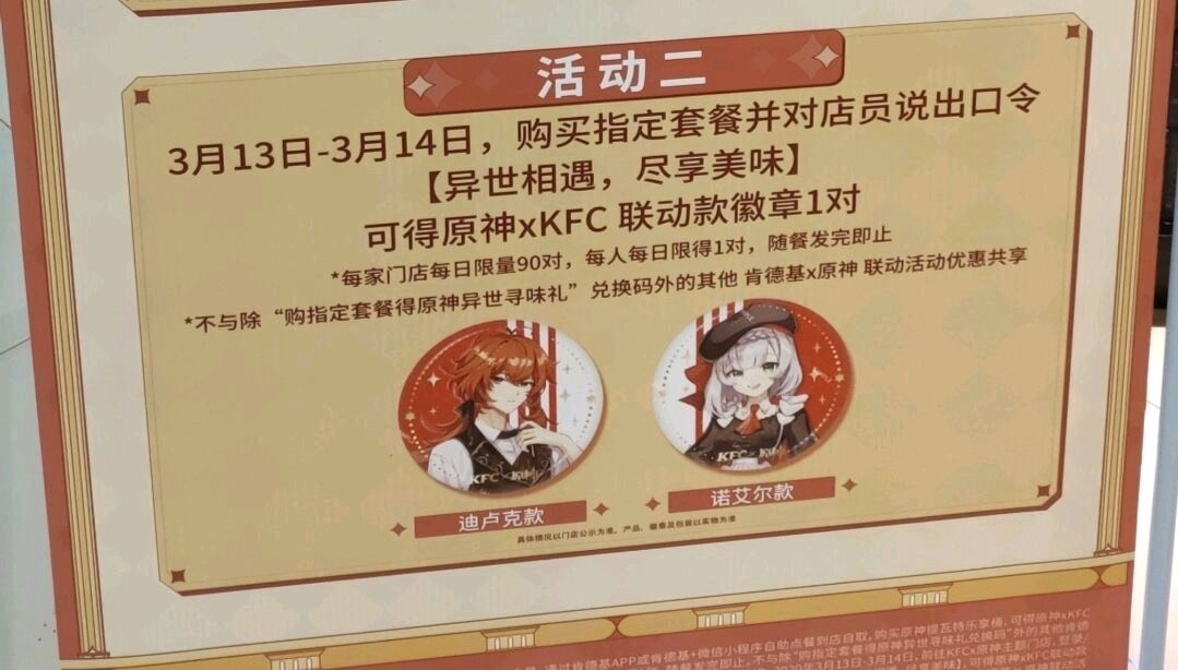 “--异世相遇尽享美味! --拿一个二次元女仆套餐!” 今天《原神》与肯德基的联动开始了,一般来说线下联动无疑是给玩家们发福利,用买一份东西的钱能得到两家的东西, 有时候甚至还是限量品,对于热爱收藏的玩家再好不过了。但是,《原神》本次与肯德基的联动,多少掺了一些“整活”的策划,让有些玩家面临“社死”(社会性死亡)的味道。 我们先来看看具体的联动内容吧: 等等…… “购买指定套餐并对店员说出口令【异世相遇,尽享美味】”?这个小细节让人不得不直呼鬼才策划啊。 我去肯德基买东西参加联动活动就算了,到指定的主题店里还得去对接口号,肯德基周末人本来就多,再让我大喊口号也太羞耻了吧… 于是,比较“害羞”的玩家们对于该怎么拿这份套餐展开了激烈的讨论。其中不乏玩起口令梗的… 也有“反向操作”,通过放高自身的姿态,大声疾呼“肯德基也搞二次元了?让我看看”的方式去拿到联动奖励并避免带给自身的伤害。(这招高 更有甚者,还有猜想当天玩家们鼓足勇气去“隔壁”强行对暗号的 虽然对“对接口令”这个行为比较羞耻,但是想想如果要是能去肯德基的店里能看到《原神》coser小姐姐的话,对口令这些也就不算什么事了。 不过以上都是来自网友们的臆想,《原神》与肯德基联动活动中对接口令的时间在3月13日-3月14日,到时候应该不会有店员这么较真的让玩家大声说出口号吧,不会吧…… 图片来源于网络、侵删 |