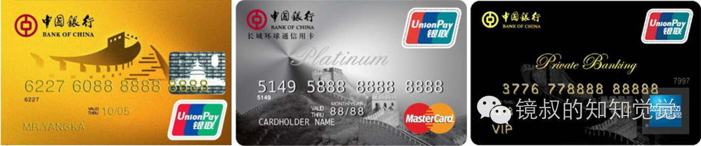 其次的话,是有明确并良好应用的主视觉的。以招商、中行等等为代表。 好比招商的金葵花—— 中国银行的长城—— 对了,建行的龙卡也还凑合吧,至少还有个龙——