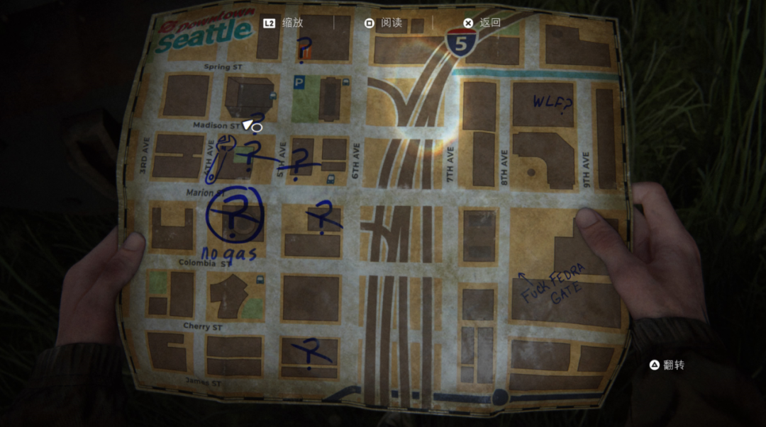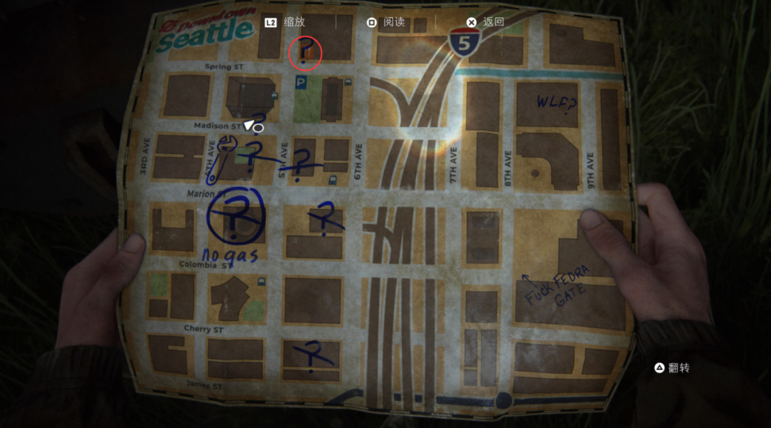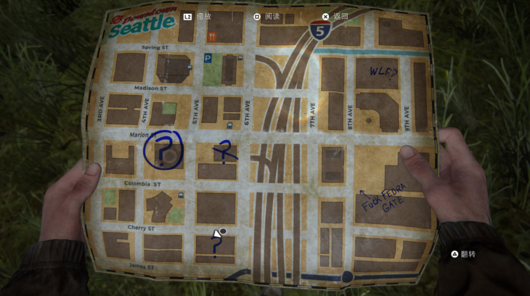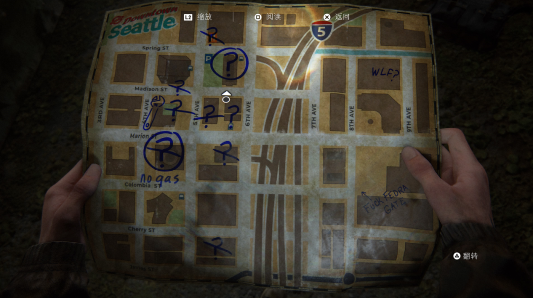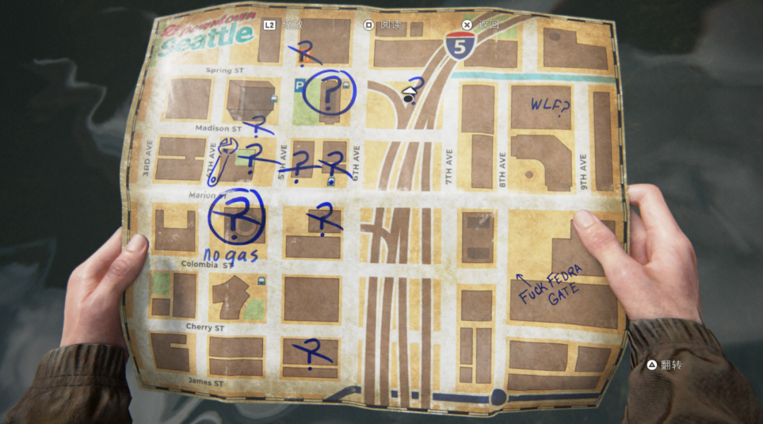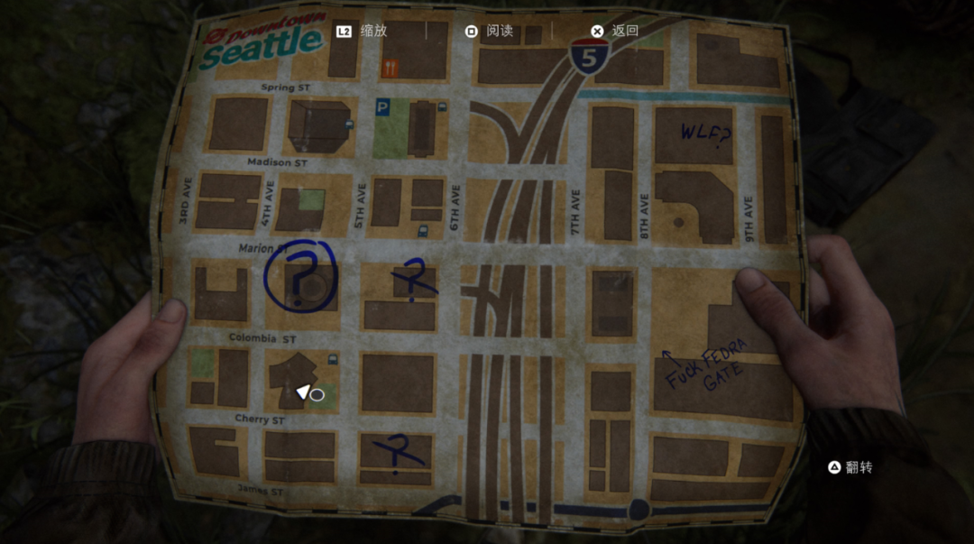 市中心 收集要素:收集品18 收藏卡5 日志记录2 工作台1 保险箱3 训练手册1 武器:霰弹枪 本章节为半开放式地图,长按触摸板调出【西雅图的地图】可以查看玩家的所在位置以及有收集物的位置(会以?标出,这个地点收集完毕后会划上横杠),此外去过本章节的所有标有?场所后会解锁奖杯【观光者】。全?场所见下图。 29.收集品:宝藏猎人留言 地图中间的断桥上,从卡车底下钻过去,在骷髅旁边的包里。 30.训练手册:制作训练手册 上个收集品所在断桥的左边,爬上卡车跳到对面,然后放下消防车的绳索,爬下去荡到对面,在集装箱内部。