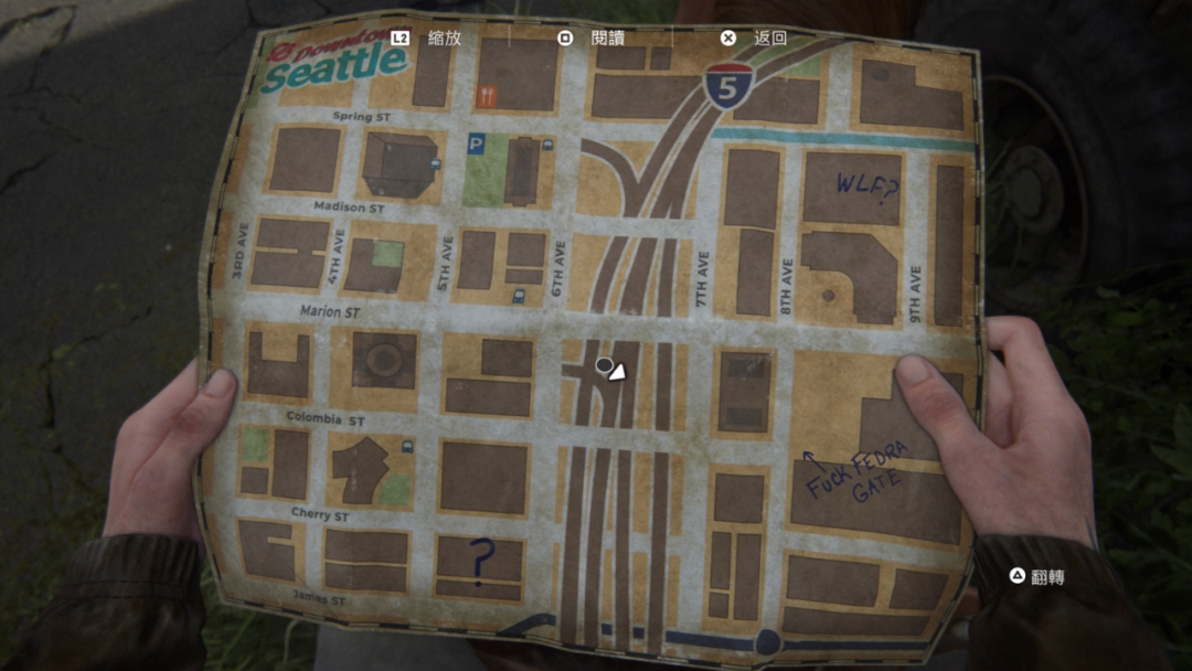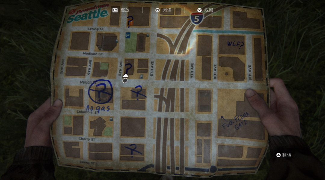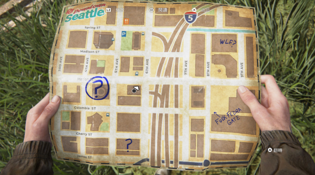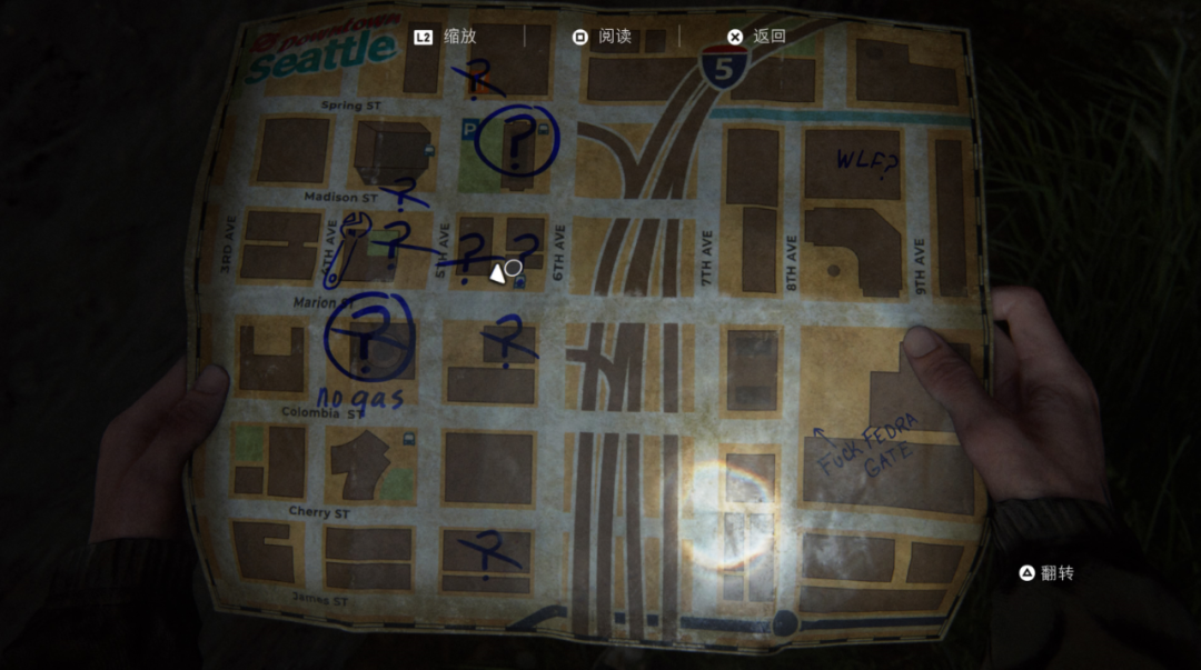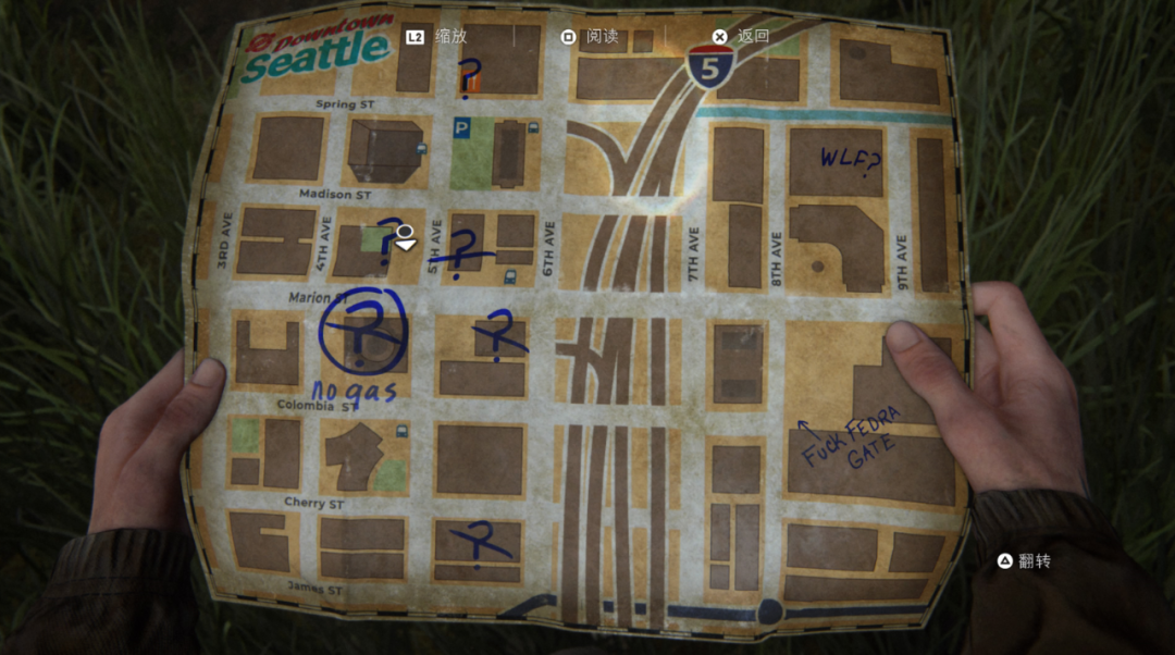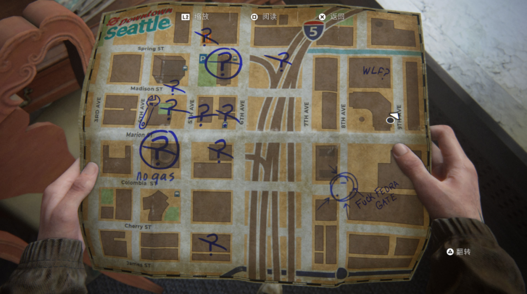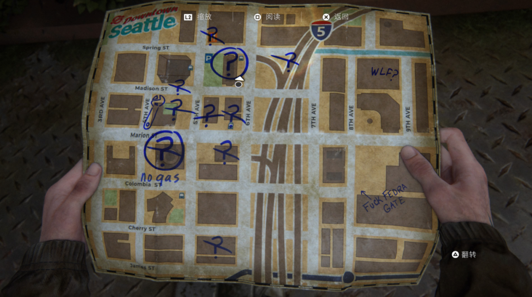市中心 收集要素:收集品18 收藏卡5 日志记录2 工作台1 保险箱3 训练手册1 武器:霰弹枪 本章节为半开放式地图,长按触摸板调出【西雅图的地图】可以查看玩家的所在位置以及有收集物的位置(会以?标出,这个地点收集完毕后会划上横杠),此外去过本章节的所有标有?场所后会解锁奖杯【观光者】。全?场所见下图。 29.收集品:宝藏猎人留言 地图中间的断桥上,从卡车底下钻过去,在骷髅旁边的包里。 30.训练手册:制作训练手册 上个收集品所在断桥的左边,爬上卡车跳到对面,然后放下消防车的绳索,爬下去荡到对面,在集装箱内部。