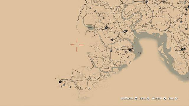 地图的西南部有两个非常重要的位置:黑水镇(Blackwater )和犰狳镇(Armadillo)。在游戏中你会很多次听到亚瑟和范德林帮派的其他成员谈论黑水镇的信息,这里也是游戏中的主要剧情点。再往西南是犰狳镇,也许在这儿你会想起《大镖客1》中的相关内容。在南边,你会看到罗德岛(Rhodes),在那里你可以品尝一下当地的酒吧供应私酿酒,度过一段惬意的时光。