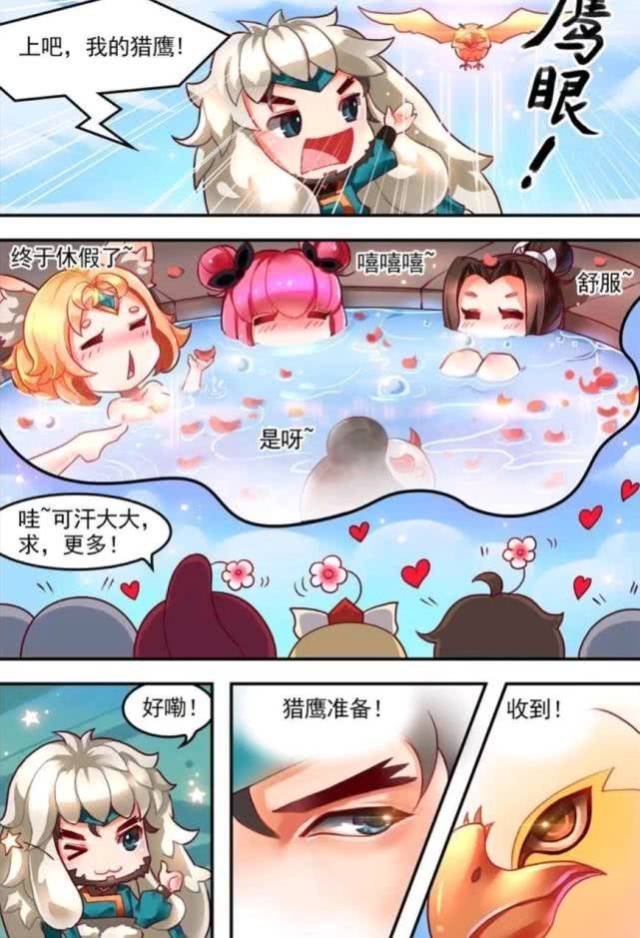 第三张图,就在韩信和孙膑为这事苦恼的时候,成吉思汗站了出来自信的说道:“这种事情对我来说小菜一碟,看我的吧!”三人偷偷的躲到了妲己泡温泉旁的草丛中,只见成吉思汗使用了一技能将自己的猎鹰朝着温泉的地方射了过去,这时天空瞬间变亮了,此时可以清晰的看见妲己不知火舞等人正又说又笑的在泡温泉。韩信看到如此美丽的风景口水直流,还不停的让成吉思汗利用一技能来照亮天空……