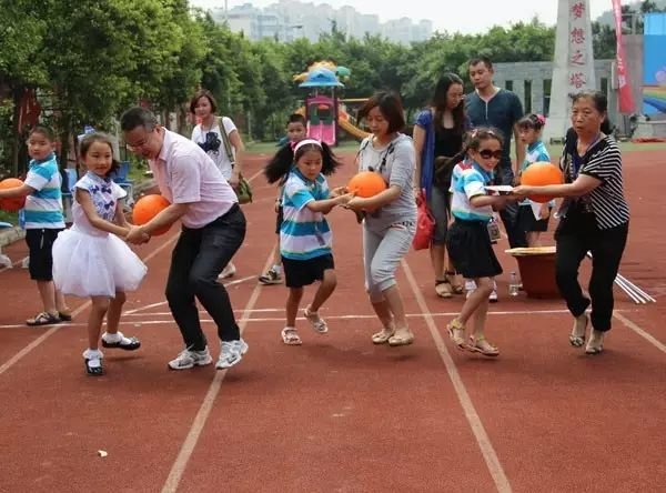 6、小鸟回家 玩法:用8个呼啦圈拼成一个小圆圈,家长站在呼啦圈内当鸟妈妈,幼儿在大圆圈线上自由地学小鸟飞,当教师说出"老鹰来了,小鸟快回家!"时,幼儿赶紧跑回呼啦圈内,投入妈妈的怀抱,先回到家的小鸟获胜。 规则:小鸟须在固定的线上飞行,家长不能离开"家"。 玩法:幼儿与家长分别站在跑道的终点和起点。开始哨响,幼儿拿起乒乓球跑向家长,家长随即将球用球拍托着走回起点。先到者为胜。 规则:托球过程中球不能落地或用手碰球。球落地得回到终点重新走回。 玩法:家长坐在地上,幼儿坐在家长腿上,双手环住家长的脖子。家长利用手脚和臀部的力量向前行进,先到终点的家长获胜。 规则:孩子必须坐在家长身上。 9、火箭发射 玩法:家长双手托住孩子腋下,用力将孩子举高,然后放下,再举起。在一分钟内,举得次数多的家庭获胜。 规则:1、孩子的双手必须平举,不能抱着家长。2、每次放下孩子的双脚必须着地。 玩法:一名家长与幼儿手拉手,将球放在上面,身体侧向迅速前进,先将球运动终点为胜。