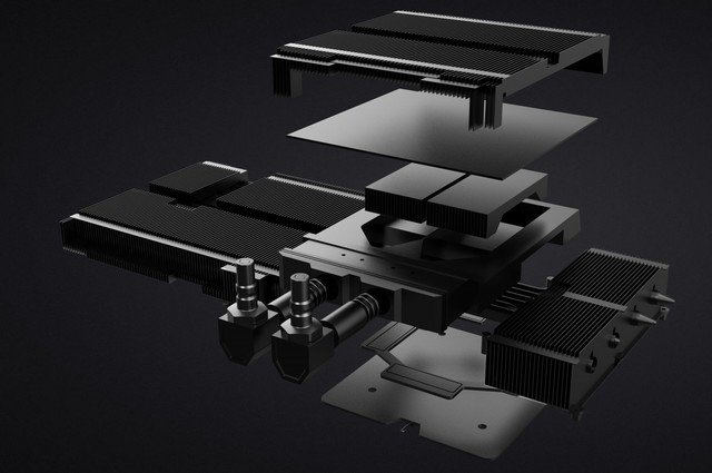 其内部采用了三层设计,贴近芯片部位依旧为核心导热的真空冰片层;我们常见的散热鳍片也采用了上下分模的不同设计,可将中间的“鳃纱”水道层严密包裹其中,形成良好的无缝风水散热;而作为水冷部分的散热核心,“鳃纱”水道内也采用了如同肺泡处的毛细血管,增大冷却液传到面积。