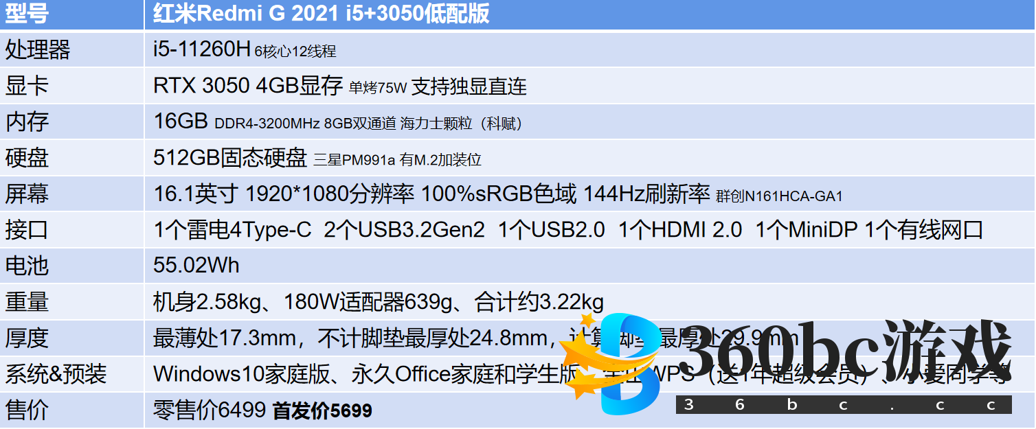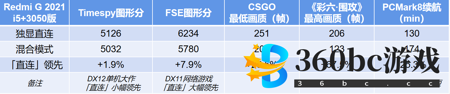 视频版: 阿B版: 【WYK数码】2021款Redmi G 3050版首发评测:水桶级入门游戏本(含抽奖活动!)_哔哩哔哩_bilibili(文章最后有抽奖规则,记得参与哟) 去年红米推出了Redmi G系列,不过由于只有1650和1650ti的两个显卡配置,定位比较尴尬,只有最低配版本的GTX 1650由于4999的售价还算值得推荐。今年也一度有Redmi G系列已经被砍的传闻,当时我觉得还挺可惜的。 没想到最近官方比较突然宣布了Redmi G系列出新,而且是3050与3060的双版本。 放在往年的话红米已经入场晚了,但是2021年比较特殊,给了红米补救的机遇。 这次有幸通过多位朋友的帮忙拿到了Redmi G 2021的11代i5+RTX3050的低配版。从定位上来说3050版是沿袭去年的「入门游戏本」定位,而3060款是新的尝试。 当然提前拿到机器不意味着会只说好话,相反我觉得把机器真实情况告诉大家才是对得起各位观众信任的做法。我也愿意相信所有认真做产品的厂商会接受对产品本身的合理批评。 由于最近在外出差,视频拍摄条件不如平时,拍摄经常会用手机1倍焦距放大,故有不少噪点和偏色,还望见谅。 我也知道大家肯定更关心AMD+3060的高配版,毕竟R7-5800H+130W释放的RTX3060+独显直连,而且如果消息没错的话首发价仅6999,可以说是抢到赚到。抢不到?骂爆!(狗头) 之后我会努力找找关系,希望能借到一台3060版,借不到就只能自费买了。 今天给大家测评的是这台Redmi G的3050低配版。 话不多说,我们先来看一下这次Redmi G的3050低配版配置。 ![]() 仅代表我手头这一台配置,不清楚是否有使用多家的物料。不过一般同批次的物料是同级别物料,可能有差距但无代差;要是真出现有出现不同级混用,比如混了QLC硬盘,那直接建议冲了红米… 关于预装软件,一个个人的好评点,机器自带一个笔记本使用手册软件,各种超链接对应小问题,对于小白非常友好。 机器零售价为6499,首发价5699。 首发价买得到的话很香。老规矩,买到赚到,买不到骂爆。 Redmi G 2021的3050版和3060 版外观不同。 3050版A面延续了上一代的A面,一种非对称的游戏化设计,外观见仁见智。 ![]() B面3 边窄边框(宽度约半指),下巴宽约2指,非常别开生面。摄像头从上一代的下巴位置移到了上部。 ![]() C面触控板较大,有数字键盘,但砍掉了最右边一排,Enter移到了下方点按钮的右侧,加号移到上面。开机键在数字键盘右上角,按压力度与常规按键相同,按下后为待机。 ![]() D面出风口,上方一长排脚垫,下方角落2个脚垫。 ![]() 之前视频上传后,有不少朋友问「什么是独显直连」。稍微解释一下,其实笼统来说「独显直连」就是显示画面时候绕过核显,优点是可以增强电脑的图形性能,不过相对应会缩短离电时候的机器续航。 我们就用这台Redmi G 2021的3050款来举例子。 ![]() 「独显直连」模式下,可以看到DX12的Timespy小幅度领先,DX11的Fire Strike Extreme领先幅度较大。实际游戏表现中,「独显直连」在网游上有较大的帧数提升,在最新的单机大作里相对比较接近。 在网游中,独显直连有着比跑分更大的优势,不过续航也确实削减了1/4。 机器默认混合输出,而切换成独显直连的操作比较简单。 打开机器自带的软件「小米游戏盒子」,下方有一排按钮,其中最右侧的鼠标移上去之后会显示「独显直连」,表示目前机器为「混合输出」。 ![]() 点下去之后会说要开始重启,按下之后一路选择是/同意,机器会进入重启,这时候不要关机,耐心等待。等再次启动之后,机器就完全由独立显卡输出,屏蔽了核显。 当然也可以通过重启之后反复按Delete,进入BIOS然后进行更新(BIOS是小米自己做的,比较傻瓜化,很好理解) 之后测试都会打开「独显直连」。 机器支持Fn+K组合键切换性能档。 Fn+K按钮支持3档性能模式:静谧、均衡、极速。 后续文章里,续航测试中会放在静谧模式,其他性能测试均放在极速模式。 关于三种模式的具体性能释放、散热和噪音,之后也将详细地说明。 11代酷睿H45标压移动处理器i5-11260H处理器,6核12线程,最大睿频4.4GHz。 ![]() 11代酷睿H45标压移动处理器i5-11260H处理器,6核12线程,最大睿频4.4GHz。 实测处理器单拷可达75W性能释放,Cinebench R23多核性能为9988,比Redmi G前代i5-10300H提升约87%。 ![]() 分数可以稳定在3820-3860范围内,比较坚挺 9988分。 ![]() 分数稳定在1475-1500之间。 ![]() 显卡为RTX 3050,4GB显存。 ![]() DX12的Timespy图形分为5126,相对更体现最新单机游戏表现。 ![]() 由于FutureMark上没有3050 notebook的数据,因此可以看一下5126分的大概是什么位置地移动端显卡。(取4000-6000分的移动端显卡) 跑分仅表示大致位置,不代表实际差距,大家定性了解即可。 大致上强过移动端的1660Ti Max-Q和1070 Max-Q,不如移动端的1660Ti和1070。 ![]() (这刀法,再次感叹一句,牛,老黄,牛) DX11的Fire Strike Extreme图形分为6234,更体现旧单机和大部分网游表现。 ![]() 开启全最高画质(阴影也手动开到最高档),录像模式播放Animajor决赛LGD打EG第二场,使用完美世界OB视角,全场平均帧数120帧。 ![]() 其中两波最高压时间。 37分30秒Ame的TB跳脸团战一直到38分09秒团战结束,最低帧数81帧;40分55秒~41分45秒的肉山团,完美世界OB为了获得最大信息量把画面视野拉到最高,最低帧数为59帧(实际游玩不会出现这么高视野)。 在此也借机祝西恩军团能在Ti10斩获佳绩,小将能出头!老油耻能轰鸣!争取把盾捧回来,希望LGD、IG、VG、小象(甚至鳖星)都能加油。 同时隔壁S赛我虽然不看,也同样希望S11