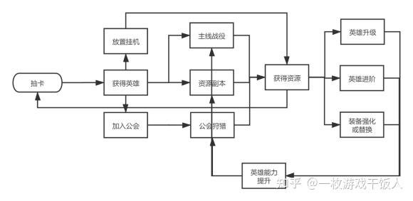 1. 每个章节内各个建筑通过战斗或者花费现金的方式占领建筑,建筑被占领后自动生产金钱;占领之后主要通过消耗金钱升级建筑提升生产效率,除此之外,还可通过指派头目、升级头目、激活羁绊、提升账号等级的方式提高生产效率; 2. 玩法内有多个街区,每个街区完成对应的任务数量即可解锁下个街区,每个街区开启后现金和建筑生产效率重置,其余内容不重置,已经探索过的街区无法回溯; 3. 玩法带有轻剧情,整体设定就是玩家是黑社会头目占领不同的街区; ![]() 1. 通过完成任务、推关、免费宝箱等方式玩家可以获得钥匙,使用一把钥匙可以随机获得一名头目卡片; 2. 头目分为不同的品质,稀有、史诗、传说,分为不同的国籍,分为不同的经营类型,不同经营类型的头目需对应到不同经营类型的建筑上,消耗雪茄可提升头目等级,对应提升收入加成、战斗力、生命值,同时可解锁或升级相应技能,技能包括对某些建筑类型的加成或者战斗加成;头目可进行升星,第一次升星需消耗同样的卡,第二次升星需消耗同国籍同品质的卡升星;等级达到一定程度可解锁头目的装备系统;按照羁绊要求达到羁绊效果可提升不同的数值属性; 3. 玩家可以使用头目卡片在战斗模块中进行战斗,战斗形式为5V5自动战斗,玩家只需在战前根据敌人阵容进行排兵布阵,战斗中的普通和技能的触发均为自动;每次战斗后都可获得雪茄,消耗雪茄可对头目进行升级; ![]() ![]() 1. 整体玩法核心追求就是放置建造提升收入解锁新街区,卡牌 RPG 更多是放置建造模块的增益,目的是提升生产效率; 2. 整个卡牌设计是属于比较典型的升级、升星系统,有点类似《剑与远征》但是整体设定更简单、策略搭配性更弱,卡牌战力验证模块也是比较简单的对战玩法,策略搭配性很低主要就是拼数值,整体游戏轻松休闲、具备一定深度的养成线; 1. 通过挂机模块、主线推关、副本可获得账户经验、英雄经验、金币、粉尘、钻石、英雄碎片、装备等; 2. 资源产出主要用于英雄获取和英雄升级、升阶,从而提升战力继续推关; 3. 轻剧情设定; 卡牌 RPG 1. 通过玩法产出英雄碎片或者消耗钻石在卡包抽卡可获得英雄; 2. 英雄分为不同品质,包括普通、稀有、稀有+、精英、精英+……神话,通过充值、活跃可获得的品质只能达到精英,其他的品质需要不断通过升阶的方式提高;卡牌分为不同的种族,不同种族会有克制效果、局内不同种族搭配会带来额外数值加成;不同卡牌分为不同的类型,包括智力型、敏捷型、力量型,其中力量和敏捷型造成物理伤害,智力型造成魔法伤害;每个角色卡牌都有其对应的职业和定位,包括法师、辅助、战士、游侠、坦克,定位包括群攻、增益、持续输出、治疗等; 3. 英雄基本数值包括等级、生命、攻击、防御暴击率等,英雄升级每次一定消耗金币和英雄经验,粉尘是在某些10倍数等级升级时消耗,每次升级可提升等级、生命、攻击、防御等基础属性值,某些10等级升级后可解锁技能,技能可在持续升级过程中不断再升级,英雄升级达到80级即无法继续升级,需要水晶祭司等级达到60级才可继续升级; 4. 游戏内英雄稀有度分为神话、史诗与普通,不同稀有度达到的品阶上限不同,神话英雄初始品阶为经营,最高可进阶至神话,神话英雄等级上限为240级(5名英雄达到240级后可利用共鸣水晶持续提高等级上限),包括4个技能,达到传说品阶后开放专属武器系统,不同的专属武器会提供不同的额外技能效果及属性;史诗英雄初始品阶为稀有,史诗月英雄最高品阶为史诗+,等级上限160,包括3个技能,并且不能用共鸣水晶突破该等级上限,普通英雄品阶为普通,不能进阶,包括2个技能; ![]() 5. 共鸣水晶能够将英雄放入空槽位中,放入后的英雄等级江河玩家受众最高等级的5名英雄中最低等级的一位拥有同样等级,英雄升级上限会受到水晶祭司中所有英雄等级的限制; 6. 装备分为基础装备、神器、专属装备,装备按照属性分为力量型、敏捷型和智力型三类特性,每个特性的装备需要配置到对应特性的英雄身上,力量型装备提供除基础三维属性外的物理减伤率、少量命中、闪避及急速,敏捷型装备提供除基础三维属性外的大量闪避及命中、少量暴击,智力型装备提供除基础三维属性外的魔法减伤率、大量暴击与急速少量闪避,装备按照品质分为粗糙、普通、稀有、稀有+、史诗、传说、神话,不同装备针对不同种族会有不同数值加成;稀有及以上品阶的装备可进行强化,强化消耗装备经验或者低阶装备、金币,强化可提升等级,等级积攒满可提升星级; 7. 神器一共只有七件,皆以艾雅命名,除提供部分基础属性的提升外,还能够提供特殊技能,例如提升每秒获得的能量,在英雄暴击后提升急速,释放必杀时添加护盾等等,这些特殊技能还能够随着神器等级的提升进一步增强。装备不同神器的英雄,在关卡中往往会表现迥异;神器可以通过“时光之巅”中的各式迷宫获得。这些迷宫对应着不同的难度等级,有着许多一次性奖励,只有满足一定的条件才可以开启迷宫;神器的升级需要对应的神器碎片,神器碎片的来源渠道极其有限,除了少部分的任务奖励之外,绝大部分数量的碎片只能通过日常挂机获得,有时一天也得不到一片; 8. 当英雄品阶提升到红色的“神话”时,英雄可以获得自己独有的专属装备;除一定的基础属性提升外,专属装备将对英雄的技能做进