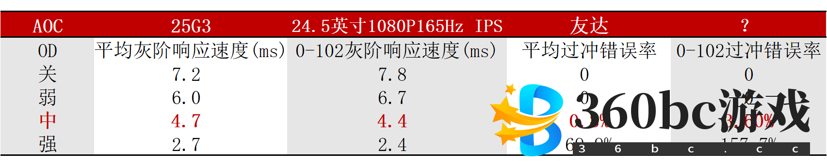 前几天有个朋友想买AOC 25G3,我说“不测,看外观和参数就知道它可能不好,看价格就知道它肯定没有性价比,现在明明知道小米24.5 165又稳又不会翻车,我们何必去赌一把买一个可能是坑的新品呢?”。但是他不信,非要买,为了制止他,我决定由我自己来踩坑、排雷。 结果是显而易见的,我买了,我坑了,我又来水文章骗赞了。 AOC 25G3基本参数为24.5英寸,1080P,165Hz,HDR400,售价1599元。定位大概是“超级爆款小钢炮”AOC 24G2的升级款。说起24G2,它可是一代传奇产品,虽然性能一般般,但是价格便宜,是曾经的京东销量冠军。可惜,24G2毕竟是19年的老产品,放在现在可谓是毫无竞争力。 按照网上的说法,25G3的面板是友达1.8,和小米24.5 165一样。但实测发现25G3很多参数远不如小米24.5 165,价格还比小米贵。请注意,我只是说AOC 25G3不好,不是说AOC这个品牌不好。要知道,AOC这两年可是贡献了无数个极具性价比的产品哦!AOC最近的良心之作是AG275QXE,性能出色,颜值超高,性价比优秀。 我直接上原图吧,懒得PS了。25G3的外观很一般,壳子看起来和AOC 24G2是一样的,只是尺寸稍微大了点。 ![]() 题外话:有人喜欢我这个桌子吗?这是淘宝买的岩板桌,表面颜色叫做“羊脂玉”,1.8*0.8m,1800元,质感非常好,有很多家店铺在卖。 虽然照片里挺好看,但这真的只是因为我们的拍摄技术提高了,产品本身并不算好看!远不如小米24.5 165。 ![]() 支架支持升降旋转,不过底座尺寸过大。我也不知道这算不算缺点,我自己对此丝毫不介意,但如果你的桌子很小,那底座太大可能会导致宝贵的桌面空间被浪费。 ![]() 接口忘了拍,是2个HDMI 2.0和1个DP 1.4。内置电源(好评),反人类OSD按键(差评)。 0%-100%亮度都是DC调光 8bit+FRC,即抖10bit。面板本身是原生8bit,不支持FRC,抖10bit是通过驱动板来实现的。而小米24.5 165的驱动板不能抖10bit(不知道新批次是否改进了),这是AOC 25G3唯一胜出的地方! 默认模式96% sRGB + 81% DCI P3,令人失望,小米是100% sRGB + 97% DCI P3。差距不是一般的大。 sRGB模式是94% sRGB + 74% DCI P3,同样失望。sRGB模式亮度还是锁死的,并不失望——我早就猜到了。而小米切换色域后依然能保持100% sRGB覆盖率,且亮度可以自由调节。 ![]() 默认模式亮度范围为77-405nit,最大亮度下对比度为1250。这个表现还是不错的。 sRGB模式亮度锁死315nit,对比度1190。该模式下因为亮度太高无法调节,所以根本不好用。 ![]() 我们用机顶盒测试了2%、5%、10%、25%、50%和75% HDR峰值亮度,结果都是410nit上下。用软件VESA displayHDR测试其10% HDR峰值亮度,也是410nit。符合HDR400标准。 全局背光,无控光分区。 AOC 25G3号称有出厂校色,所以均匀性也调的不错。默认模式下最大偏差值3.8,sRGB模式下最大偏差值3.7,在游戏显示器中应该算中等偏上水平。 ![]() 背光应该可能是AOC自制的,所以蓝色偏差有点大,两种模式的偏差最值为6.19/5.96,偏差均值为1.10/1.23,其实也算不错。 ![]() 观感上不能说好,也不能说坏,各种颜色的还原效果都不错,只是稍微有一丁点偏黄。 ![]() ![]() 默认色温是「暖色」,但是调到「正常」后又会偏暗偏白,还是默认的「暖色」比较舒服。 原生165Hz 1080 120Hz为4.3ms,正常水平 25G3的最佳OD档位[1]是「中」档,响应速度4.7/4.4ms[2],相比之下,小米24.5 165的最佳OD档位的响应速度为3.9/3.0ms,高下立判。 ![]() 同面板却有响应速度的差距,唯一的解释就是因为AOC的调教不够好。 再用飞碟图来看看具体的拖影表现,相机设置为1/125快门,飞碟速度2400。 OD关,拖影重重叠叠,第一行拖影数量有2个多,第二行3个多,第三行不到2个。 OD中,拖影有所改善,第一行2个不到,第二行2个不到,第三行1个多点 OD强,出现大量诡异的蓝色鬼影,这是因为过冲率太高造成像素运动错乱。 ![]() 结论很简单,AOC 25G3响应速度不行!拖影有点多。 讲个笑话,AOC 25G3标的是1ms响应时间,比它快的小米24.5 165Hz标的却是GTG 2ms响应。 ![]() 支持NVIDIA G-Sync Compatible,理论上也支持AMD FreeSync 基本的功能都有了,包括暗部增强,饱和度增强,辅助准星。 OSD菜单确实很简陋,或者说“复古”。 ![]() 别买别买别买别买别买别买别买。 1599元真的毫无性价比,AOC 25G3色彩、外观、响应速度都不如同面板且更便宜的小米24.5 165Hz。我认为,这种产品的定价在1299元的话会比较合适。 1599元已经可以买到雷神银翼240了,1080P240Hz,外观出色,98% DCI-P3,完美色域切换,接近1500的对比度,3.1ms响应速度。不把AOC 25G3吊起来打? (责任编辑:蚂蚁团队) |