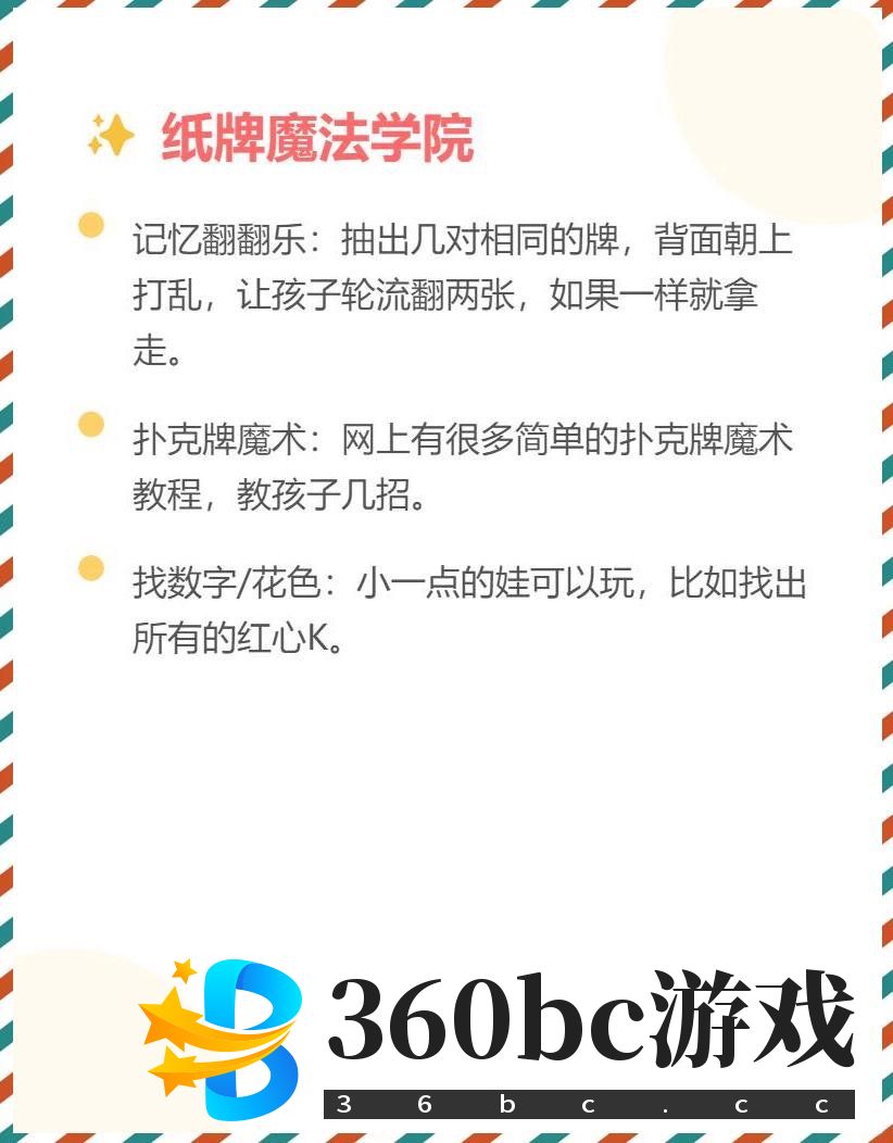 有没有觉得,每到暑假就仿佛被孩子“绑架”了?期盼已久的假期,本以为能让孩子好好放松,可结果呢?手机、平板、电视成了他们的新宠, 屏幕时间疯狂飙升。这让我真是哭笑不得,甚至有种“不如不放”的无奈。眼看着孩子们的视力逐渐模糊,专注力日渐分散,我内心焦急万分。 每当提议收回手机、关闭电视时,家中便上演一出出“闹剧”,仿佛要掀起房顶。于是,我精心挑选了 10个适合与孩子共同参与的小游戏。这些游戏不仅免费,而且对视力友好,希望能为你们带来帮助。 通过记忆游戏、扑克牌魔术和数字分类,促进儿童认知发展,同时让家庭充满欢声笑语。 ► 怎么玩 记忆翻翻乐:拿出几对相同的扑克牌,背面朝上混在一起,让孩子依次翻两张,若相同则取走。 扑克牌魔术:通过网上丰富的教程,教孩子几个简单的扑克牌魔术,让他们为家人表演,体验成功的喜悦。 数字与花色大挑战:适合小龄儿童,如找出所有红心K,既锻炼数字认知又学习花色分类。