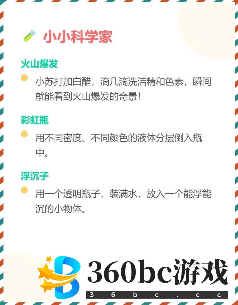 将厨房变为实验室,通过小苏打与白醋等实验探索科学现象,激发孩子的好奇心。 ► 将厨房变身为一个奇妙的科学实验室,只需利用日常用品 火山爆发实验:将小苏打与白醋混合,再滴入几滴洗洁精和色素,即可目睹火山爆发的壮观景象。 彩虹瓶制作:将不同密度、不同颜色的液体(如蜂蜜、洗洁精、水和油)逐层倒入透明瓶中,欣赏绚烂的彩虹效果。 浮沉子探索:在一个装满水的透明瓶子中,放入一个能浮沉的小物体(如橡皮泥小人),通过按压瓶子观察其浮沉变化。