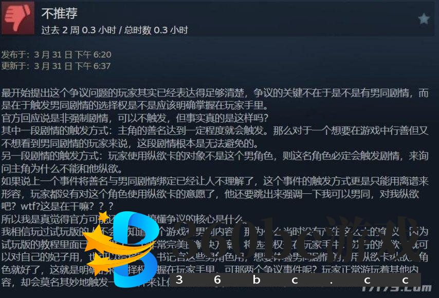 评论两极分化?国产卡牌策略游戏《苏丹的游戏》前两天发售了,游戏以猎奇向大尺度混乱邪恶剧情,以及类似《密教模拟器》的玩法,在发售前就拥有大量讨论,发售后直冲Steam国区榜首。 ![]() 不过这么一款游戏,在发售后却陷入了巨大的争议。许多人在游玩过程中无意间触发了“男桐”、NTR等剧情,这让对猎奇情节感到厌恶的玩家,纷纷在Steam评论区与各大社区开始讨伐。许多玩家质疑“男桐”剧情是否不可避免,是否在特地讨好特定群体,同时也质疑这个游戏是不是要往“女性向”发展。 ![]() ![]() 但很快也有人扒出了完整代码,玩家们雷的“男桐”与NTR情节,只有在前期增加好兄弟的好感度,同时主角“善度”达到一定数值时才会触发,并且都可以选择拒绝。拒绝后角色也依旧会老老实实给玩家打工,玩家也可以选择刀了该角色永绝后患。被“男桐”跳脸的玩家们是因为游戏发售初期,具体支线的进入方法还未形成攻略,不小心进入的。 ![]() ![]() (玩家扒出的代码) ![]() ![]() (相关事件都有拒绝选项) 并且制作组也没有“屁股”不正,除了“男桐”、NTR之外,游戏中还有许多在这里不便细讲的经典男性向内容,以及更不方便细讲的更加超出的猎奇XP,只能说不愧是混乱邪恶阵营的游戏。 ![]() 面对玩家的质疑,双头龙工作室表示他们将会在更新中加入可以对“白犀牛”使用“纵欲”的剧情。这下是以一种进一步加深游戏特色,又不会被质疑“屁股”的方式,再次强调了他们的游戏既不是男性向也不是女性向,更不是一般向,而是猎奇向的属性。 ![]() (公告部分内容) 不过,《苏丹的游戏》确实对猎奇XP预警不足,也不能怪只冲着涩涩内容买游戏的玩家们误入虎穴,如果能在简介或游戏开头醒目提醒玩家,或许就可以避免玩家们无意间踩雷的愤怒了。 ![]() (某绅士app就做得很到位) 总的来说,如果你对猎奇的混沌邪恶XP有雷点,确实要谨慎考虑入手。不过如果你是什么XP都照单全收的乐子人,想在游戏中做点现实中天大的胆子也不敢做的事,那这确实是一款乐子人永不输的游戏。 那么大家是守序善良涩涩党,还是混沌邪恶乐子人呢? ![]() 举报/反馈 |