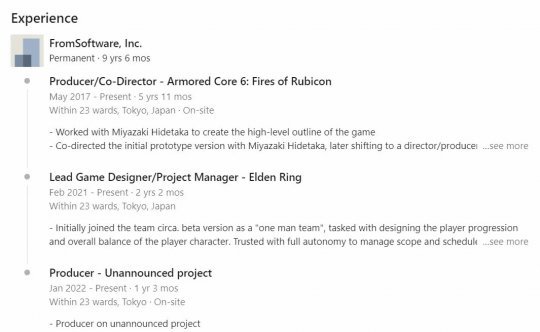 根据最近的LinkedIn更新,一名FromSoftware员工担任一个新项目的制作人至少一年了,而且这个项目不是即将推出的《装甲核心6》,也不是《艾尔登法环》DLC“黄金树之影”。 ![]() 据LinkedIn信息显示,FromSoftware员工Kenneth Chan透露他正在参与一个未公布的新项目,他自2022年1月以来就在担任这个项目的制作人。Kenneth Chan此前曾担任过《艾尔登法环》的首席设计师和项目经理,自2017年以来,他也是即将推出游戏《装甲核心6》的总监之一。 ![]() 去年FromSoftware曾宣布它正在为几个新项目招聘员工,所以这个未公布项目很有可能是其中之一。目前无法确定这个项目何时发布,《装甲核心6》预计将在2023年发售,《艾尔登法环》DLC“黄金树之影”发售时间待定。 (责任编辑:蚂蚁团队) |