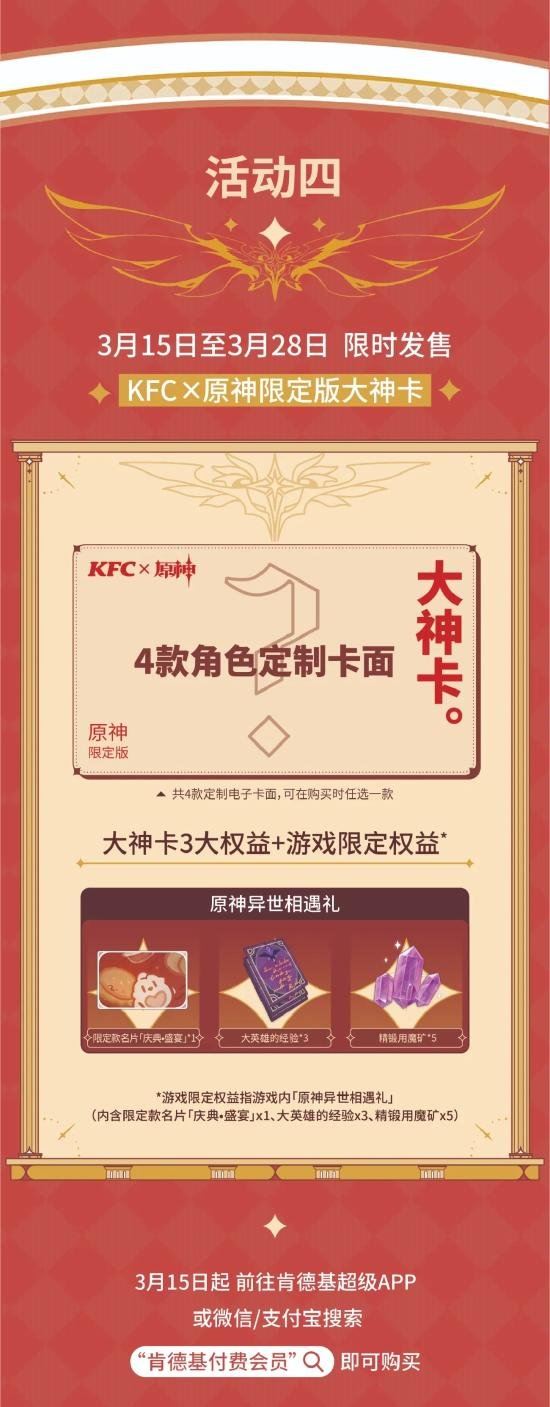 4、联动限定名片 活动时间:3月15日~3月28日 获取方法:活动期间,在微信或支付宝内搜索“肯德基付费会员”购买联动大神卡,可以得到1个异世相遇礼礼包,内含限定名片“庆典·盛宴”、经验书、精锻魔矿;