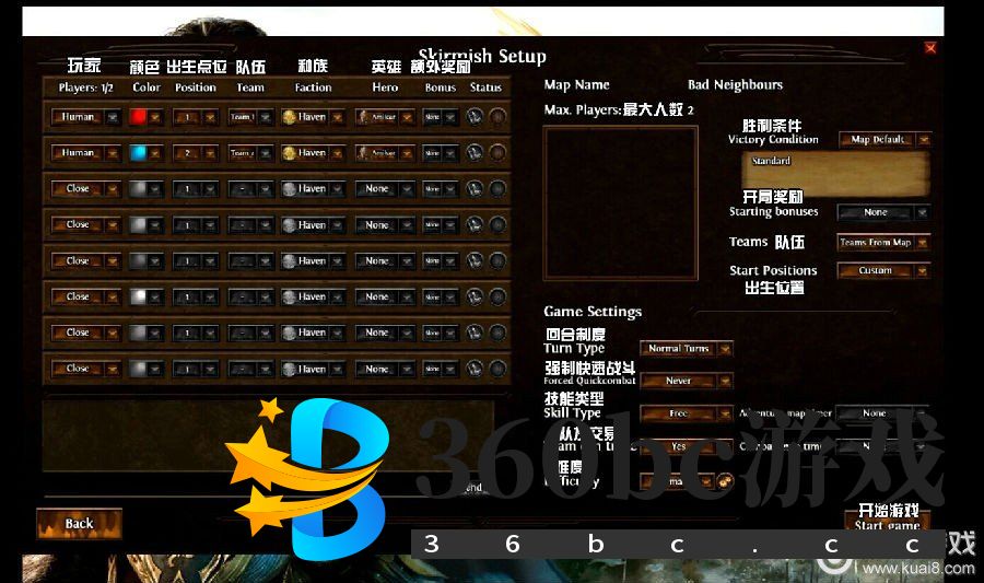 《英雄无敌7》已经放出beta测试版本,玩家可以下载免费体验,从beta版中,我们可以知道游戏怎么玩了,鉴于有一部分不懂英文,特献上玩家分享的《英雄无敌7》菜单翻译和基础讲解。 首先beta版并没有剧情模式,玩家只能进行2张地图上的自定义游戏,下面我们直接进入游戏开始教程: 首先是建立游戏界面,界面翻译如下