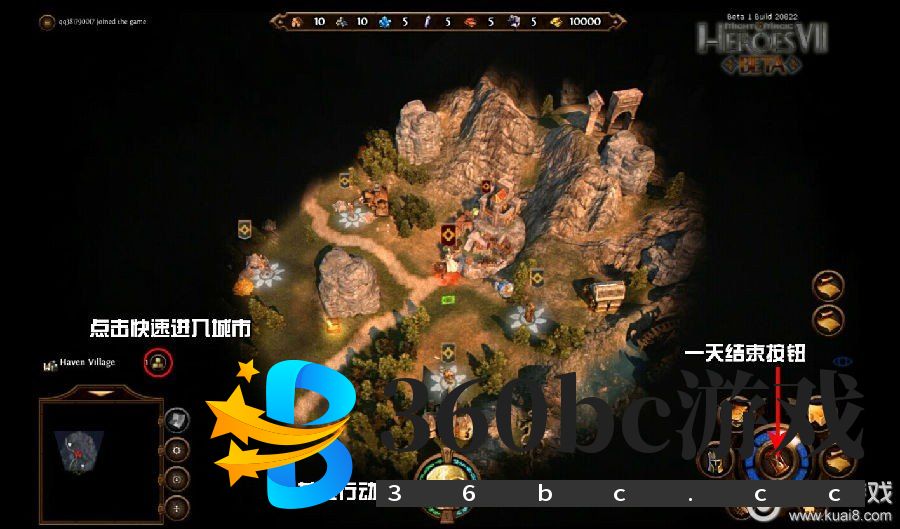 一些重要的指示如上图所示,玩家拥有的资源依旧在最上横条显示,左下小地图上方多了一个快速进入玩家控制城镇的快捷按钮,很方便。英雄状态栏在屏幕下方,左侧是行动力,右侧是魔法值,数字是英雄等级,右键头像可以看到简单的英雄属性。 右下的操作菜单和前作几乎一样,包含技能、英雄装备栏、英雄技能、移动、存档、设置以及回合结束按钮。