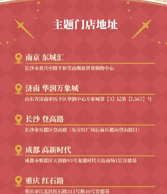 原神肯德基徽章 联动徽章需要购买套餐并跟店员兑换口令,门店口令是【异世相遇,尽享美味】; 在3月13日~3月14日期间,前往主题门店购买指定套餐,并跟店员对口令即可领取联动徽章一枚,徽章数量有限,先到先得,目前全国内自有16家主题门店,具体位置如下: